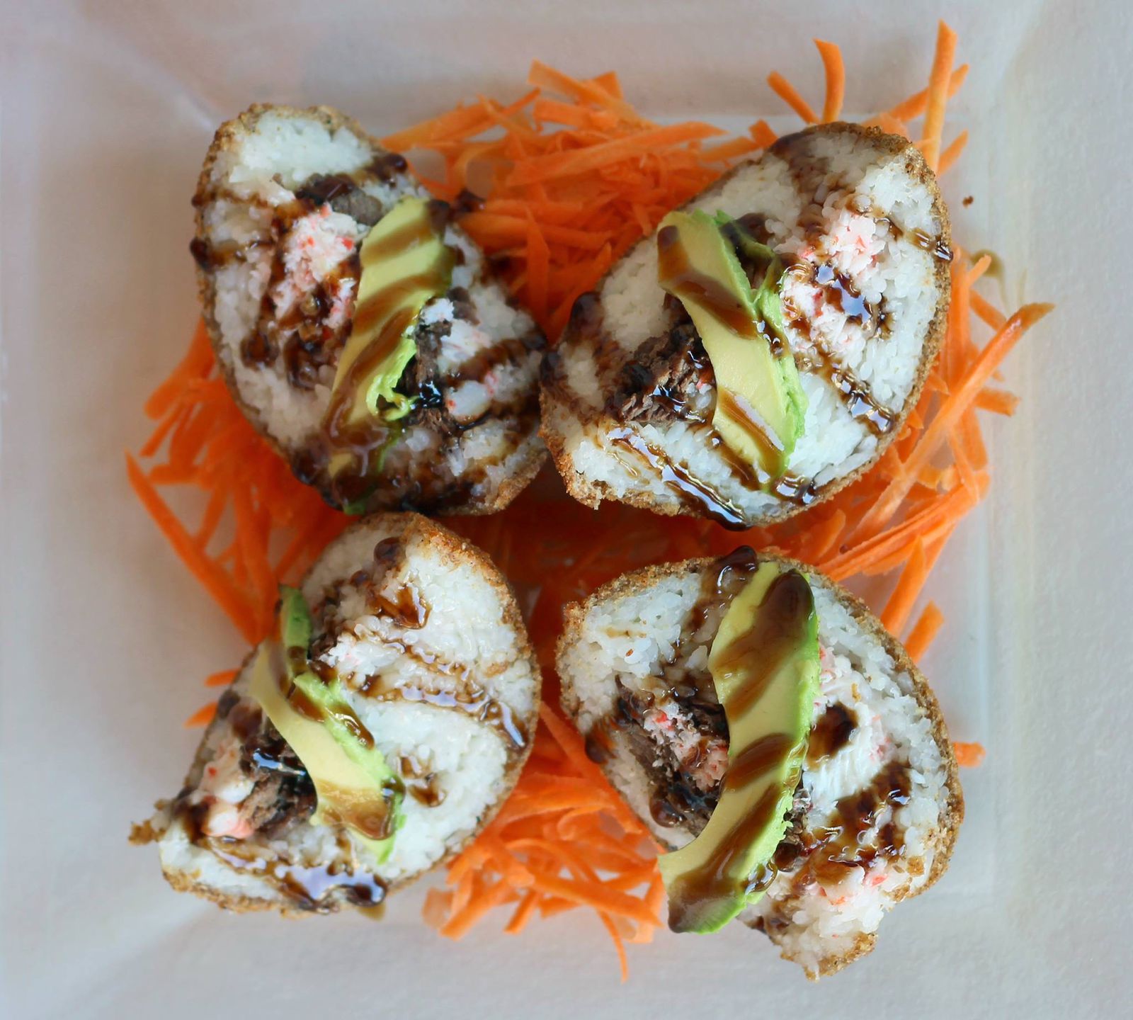 1 Bola de arroz rellena de philadelphia, tampico, camarón y carne; encima aguacate, bañada en salsa anguila y ajonjolí.