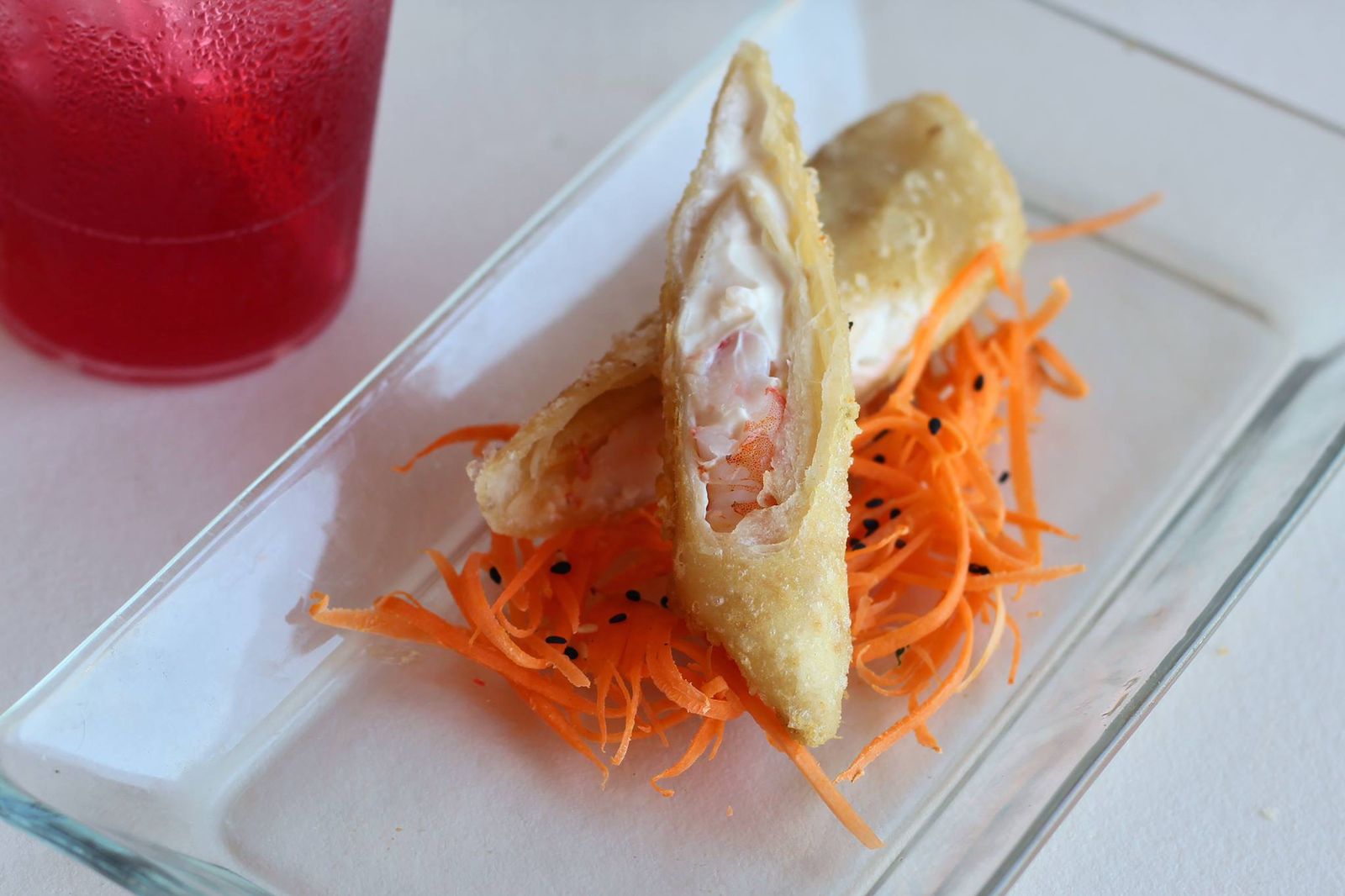 Rollito relleno de philadelphia, queso gouda y camarón.