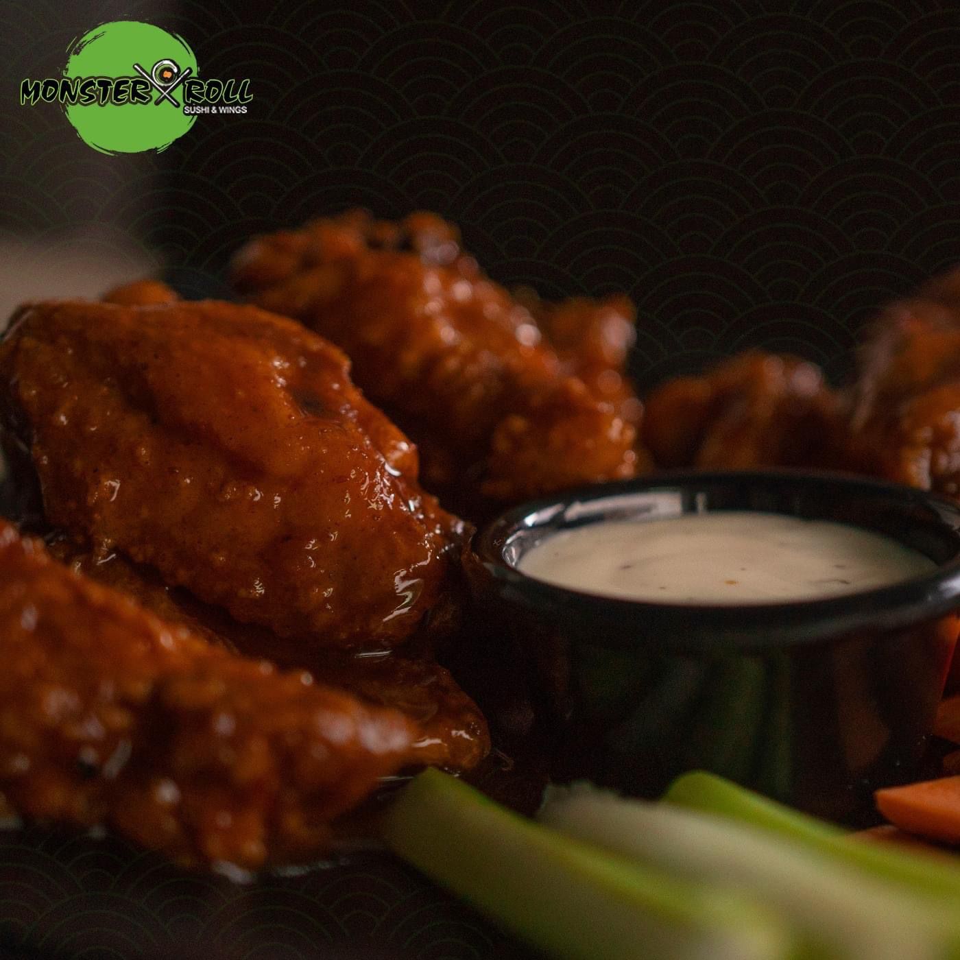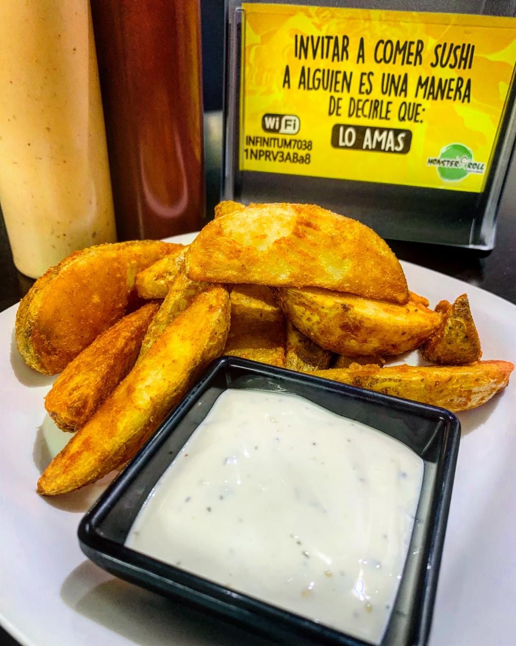 Combinación de alitas, boneless, papas gajo y aros de cebolla.