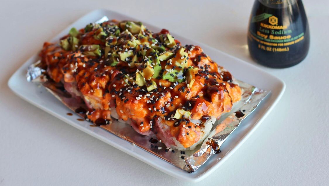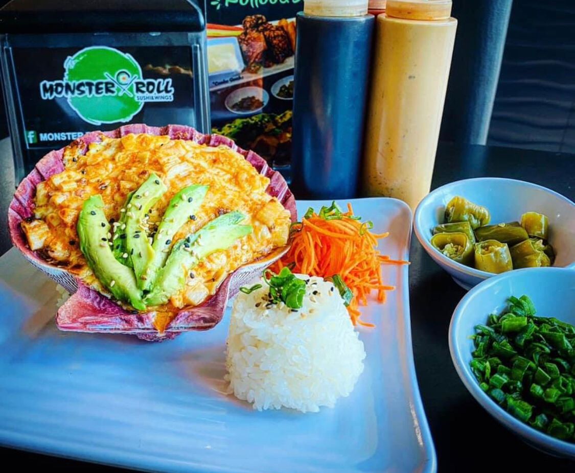 Arroz blanco con tampico carne, camarón, trocitos de philadelphia, camarón empanizado y trozos de aguacate; bañado en salsa de anguila y ajonjolí.