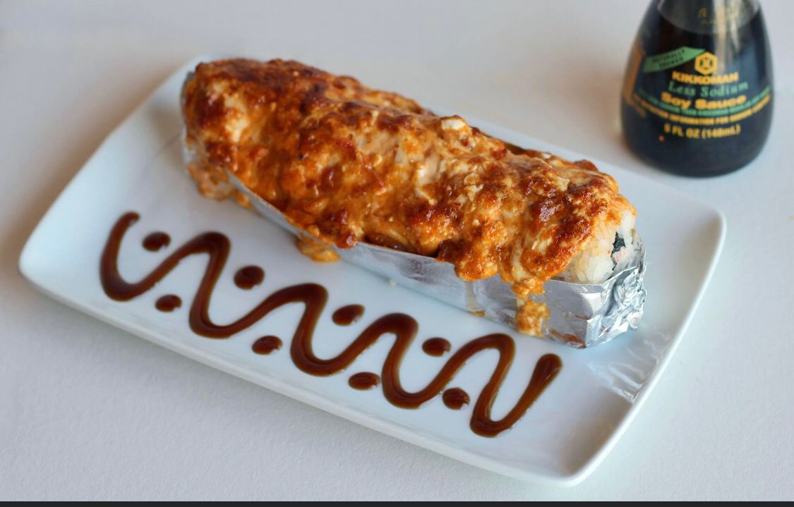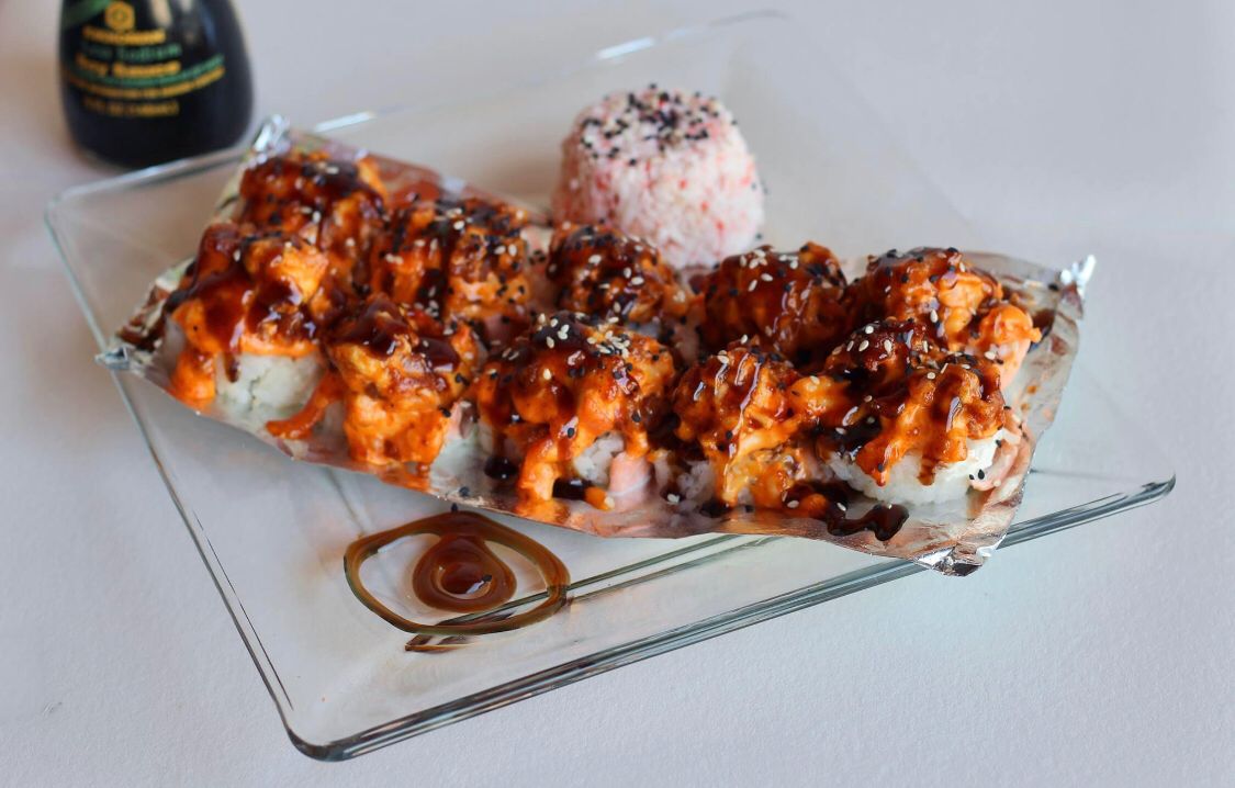 Rollo cubierto de philadelphia y salmón horneado en chipotle, con un topping de cangrejo, coronado con camarón empanizado; bañado en salsa de anguila y ajonjolí; philadelphia pepino, aguacate y camarón por dentro.