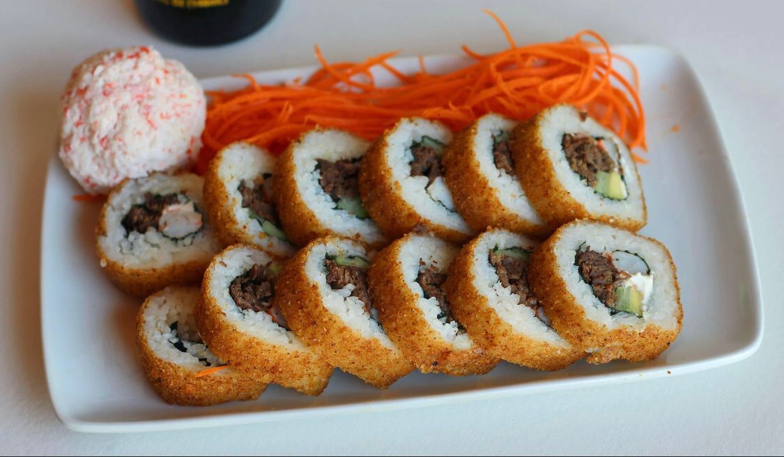 Rollo empanizado con un topping especial de res, queso gouda y tocino; bañado en salsa de anguila y ajonjolí; philadelphia, res, pepino y aguacate por dentro.
