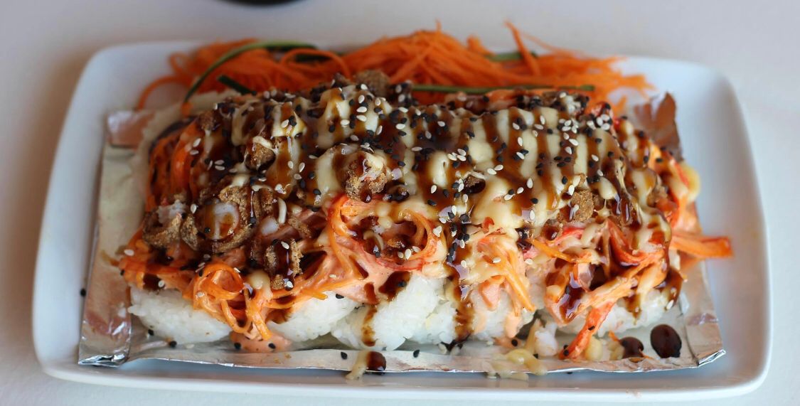 Philadelphia, camarón, pepino y aguacate adentro; por fuera philadelphia y ajonjolí, bañado en aderezo especial de la casa, sirasha, salsa de anguila y furikake.