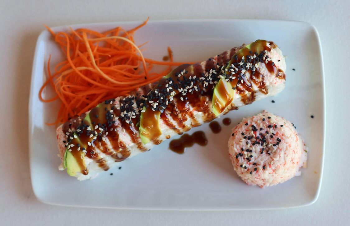 Surimi, pepino y aguacate adentro; por fuera philadelphia, pulpo y camarón; encima tampico, tiras de aguacate; bañado en salsa de anguila y ajonjolí.