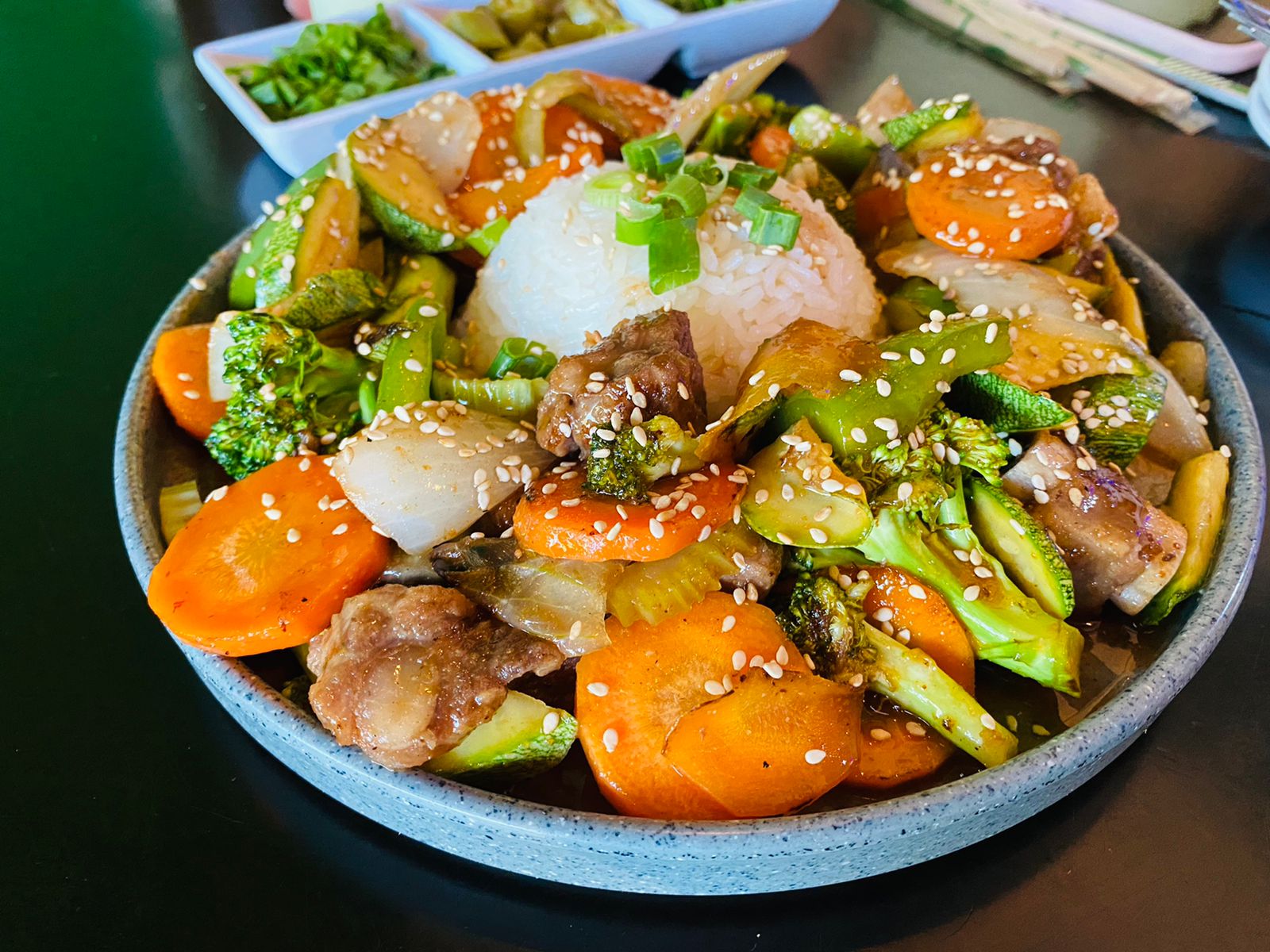 Deliciosa costillas de puerco en trozo, preparados con chile morrón, zanahoria, calabaza, brócoli, apio y cebolla; preparadas en salsa bbq y acompañadas con arroz blanco.