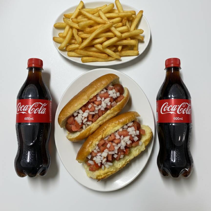 2 deliciosos Hot dogs embarazados con una orden de papas a la francesa y refresco
