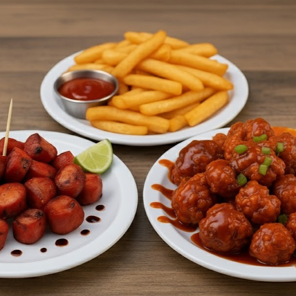 Una orden de cada cosa, papas a la francesa, salchichas asadas y boneless con salsa a su eleccion