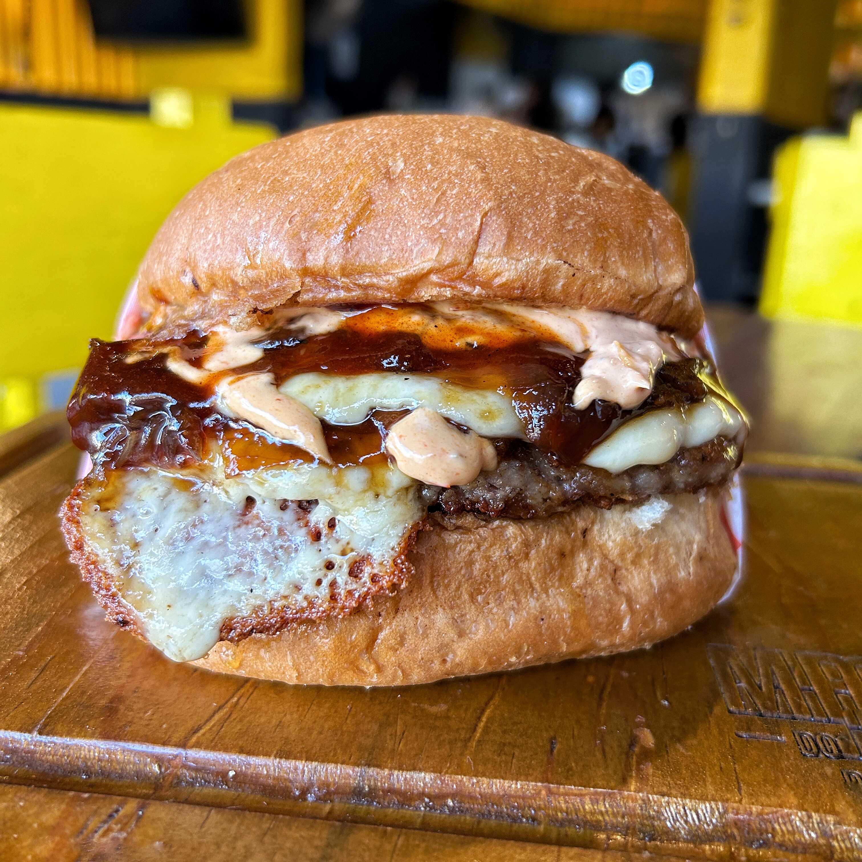 Pan, 200 g de carne smash, queso americano, tocino y aderezo thousand.