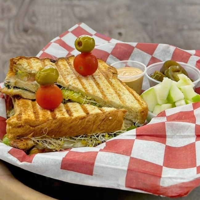 Pan integral, jamon de pavo, lechuga italiana, jitomate, cebolla, aguacate, germinado de alfalfa.