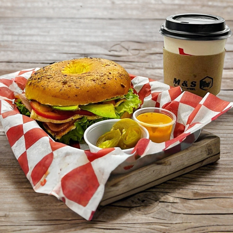 Baguel de Oregano, jamon de pavo, costra de queso, panela, lechuga italiana, jitomate, aguacate, INCLUYE CAFE AMERICANO