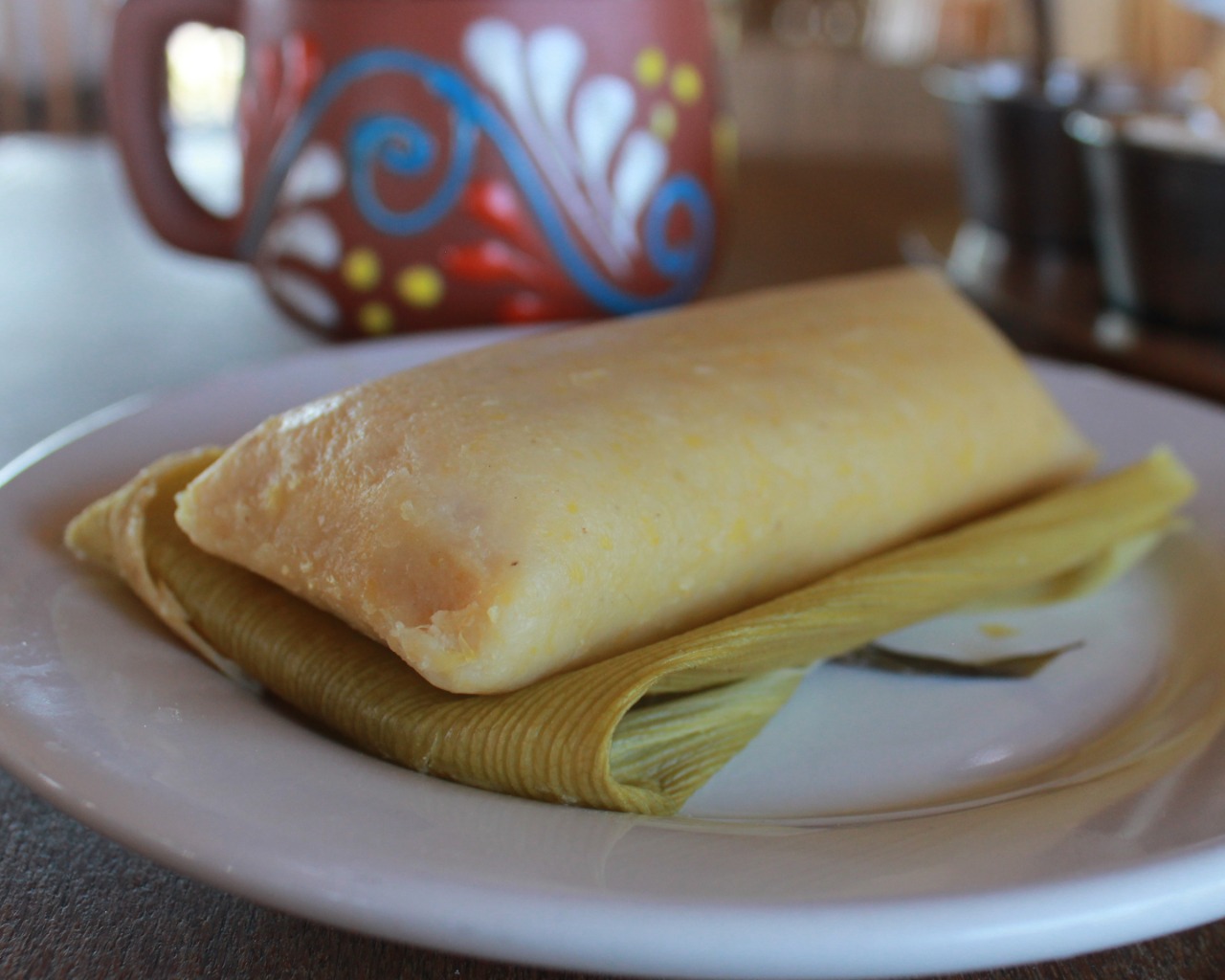 Rico tamal de elote con rajas poblanas, queso gratinado y un toque de crema.