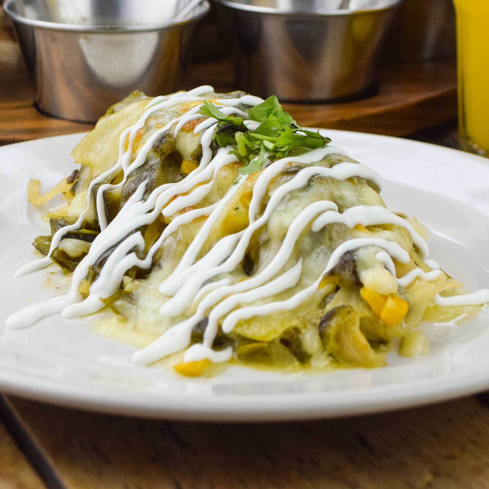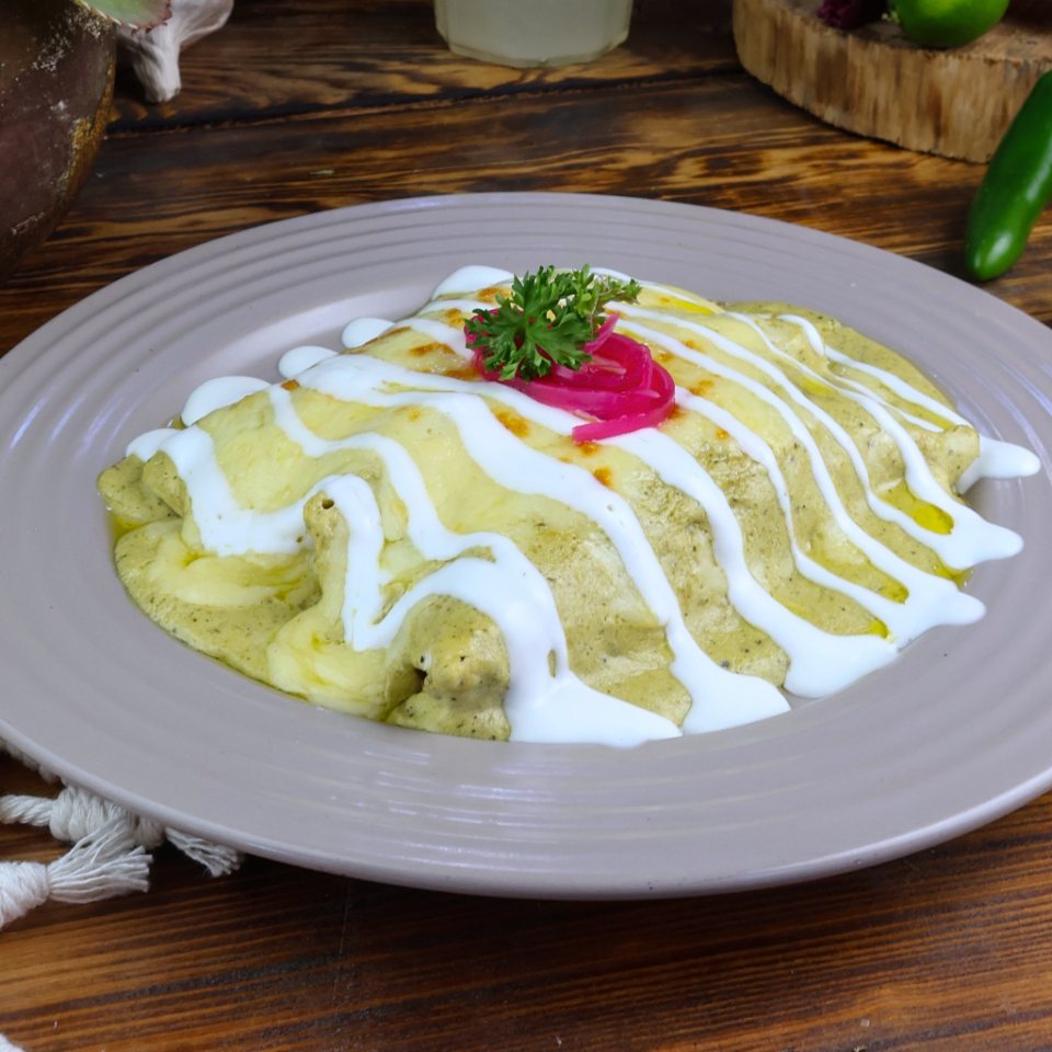3 Piezas de enchiladas de maíz, rellenas de pollo y bañadas con nuestra salsa suiza de la casa, gratinadas con queso y un toque de crema.