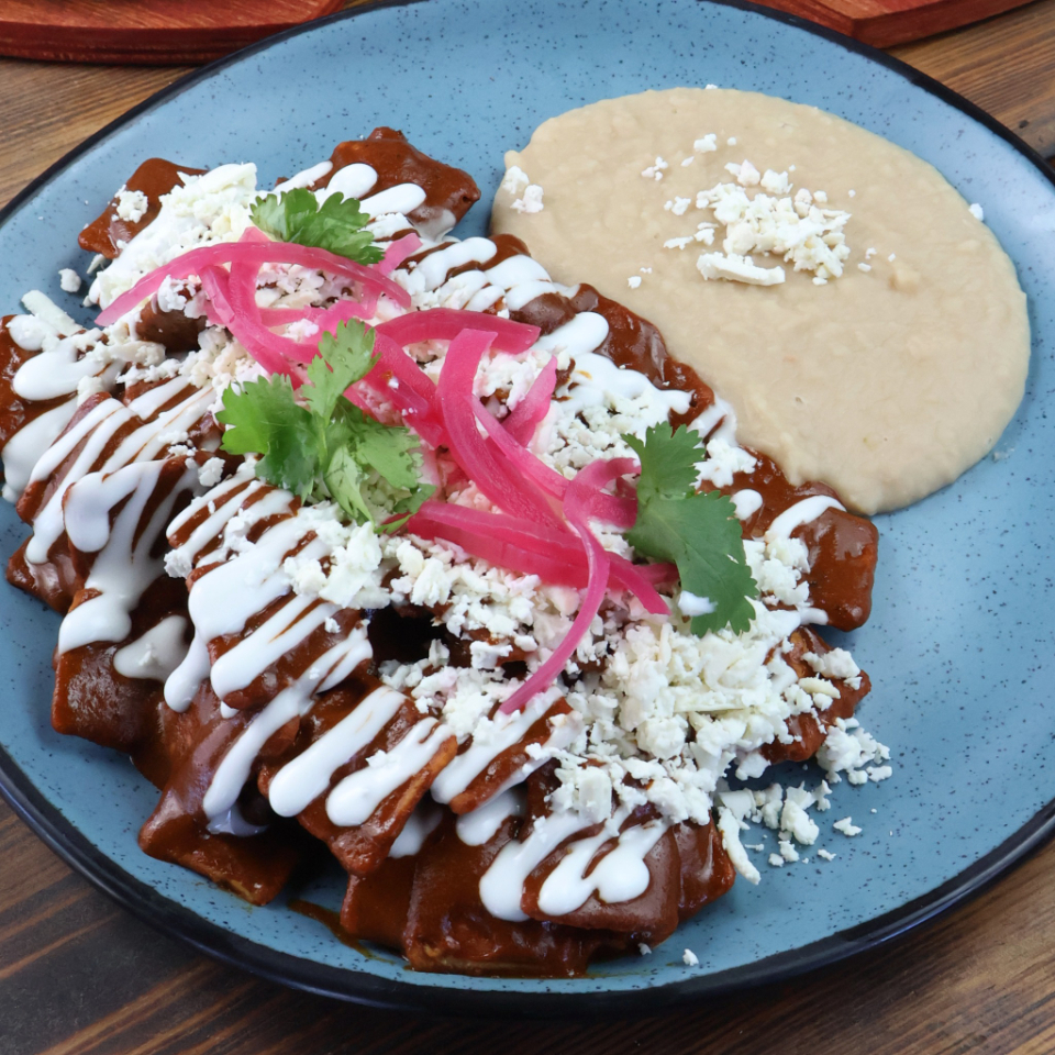 3 Piezas de enchiladas de maíz, rellenas de queso fresco de rancho, bañadas en nuestra salsa de frijol con chorizo.