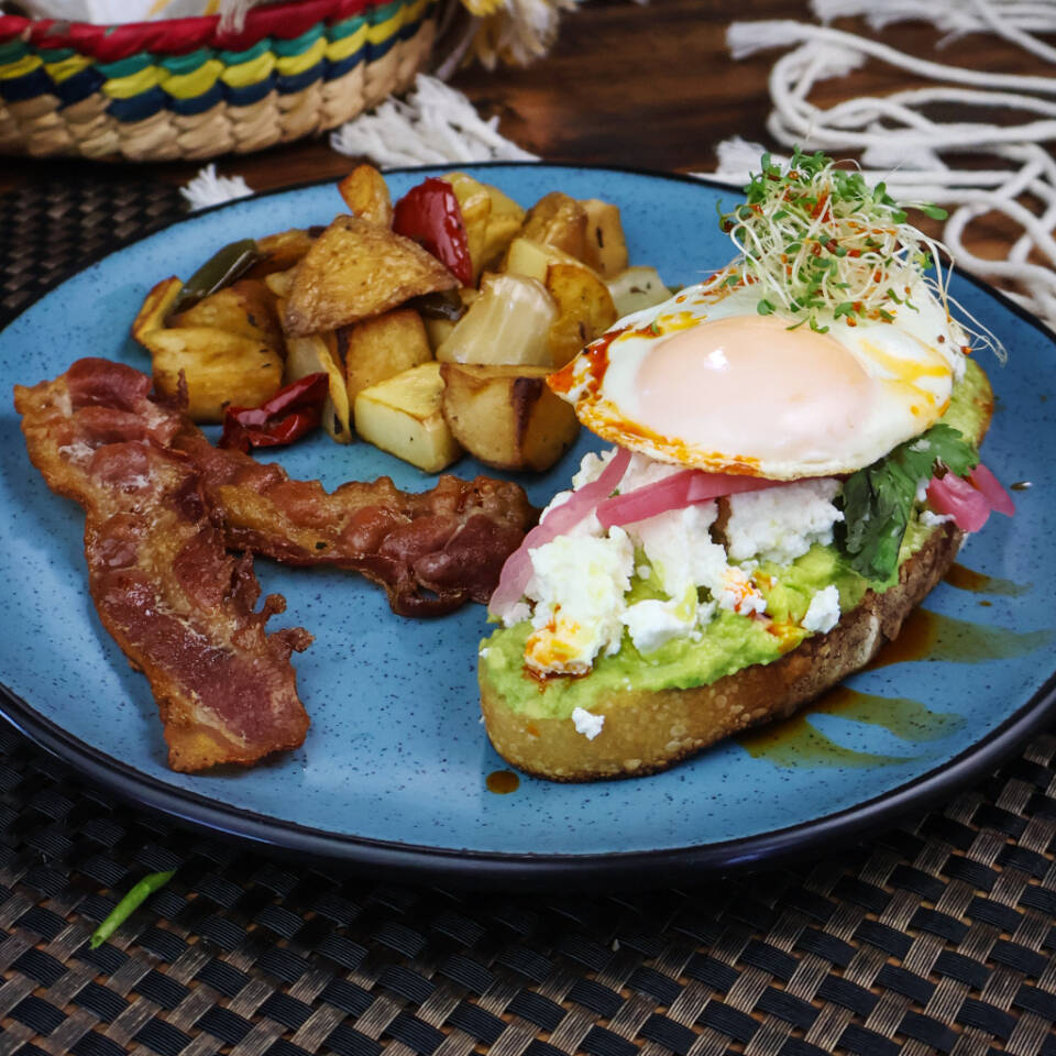 Pan hogaza de masa madre tostado con aguacate queso fresco, tomatito cherry, y un huevo estrellado, acompañado de tiras de tocino y papa campesina
