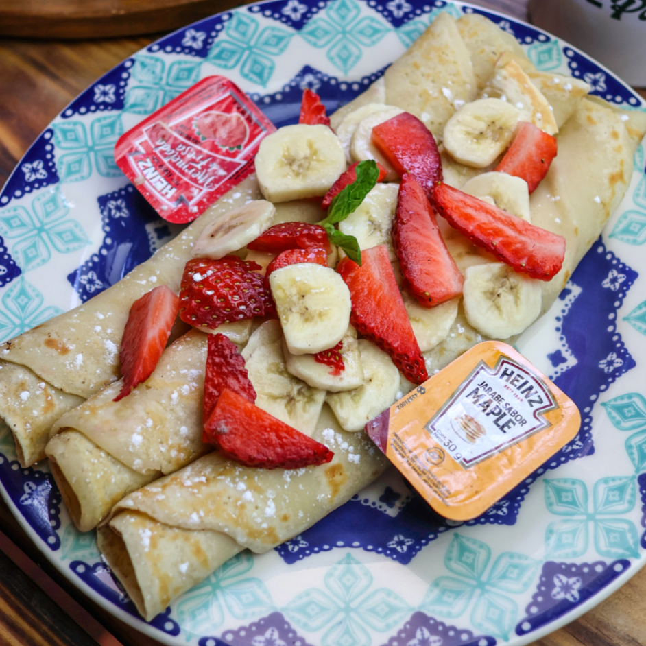 3 piezas con fresa y plátano miel de abeja y 1 topping de tu elección.