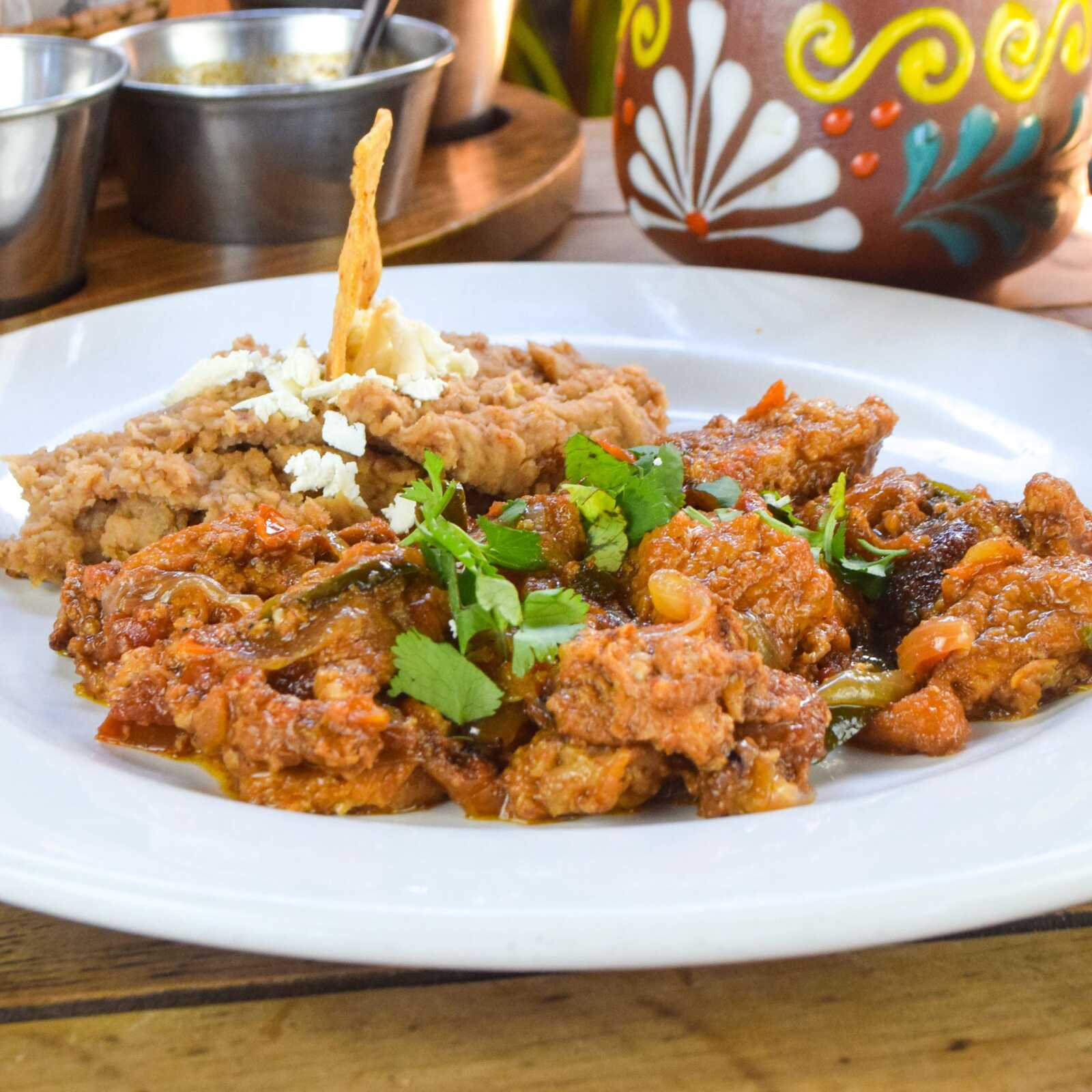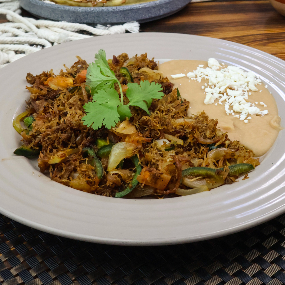 Acompañada de un taco dorado de frijol con queso y tortillas recién hechas.