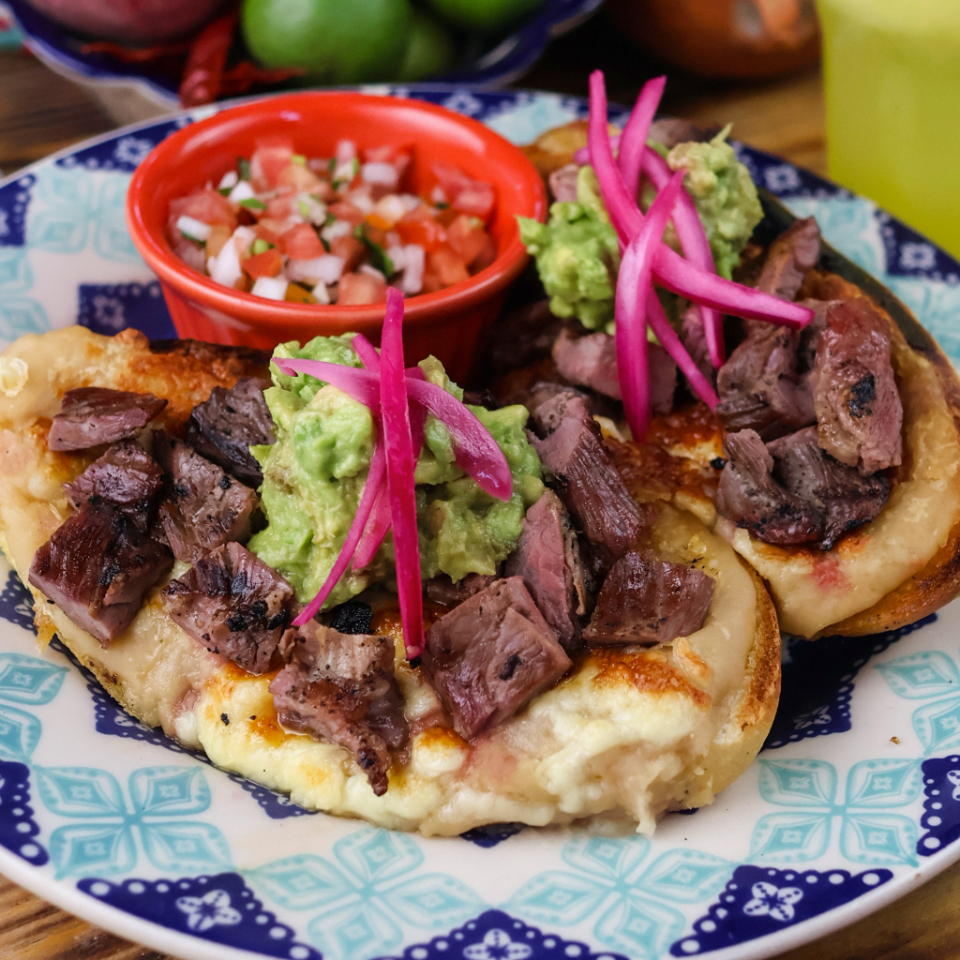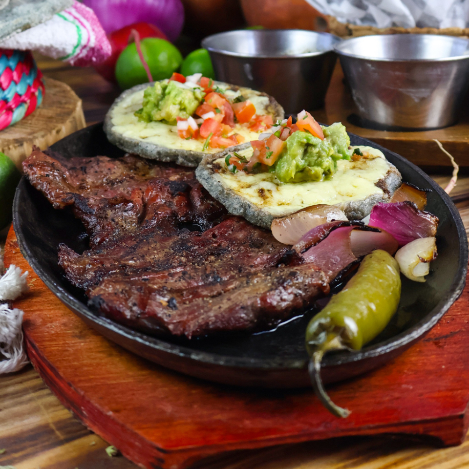 Carne 100% arrachera acompañada de dos chorreaditas con asiento, queso manchego y rebanada de aguacate.
