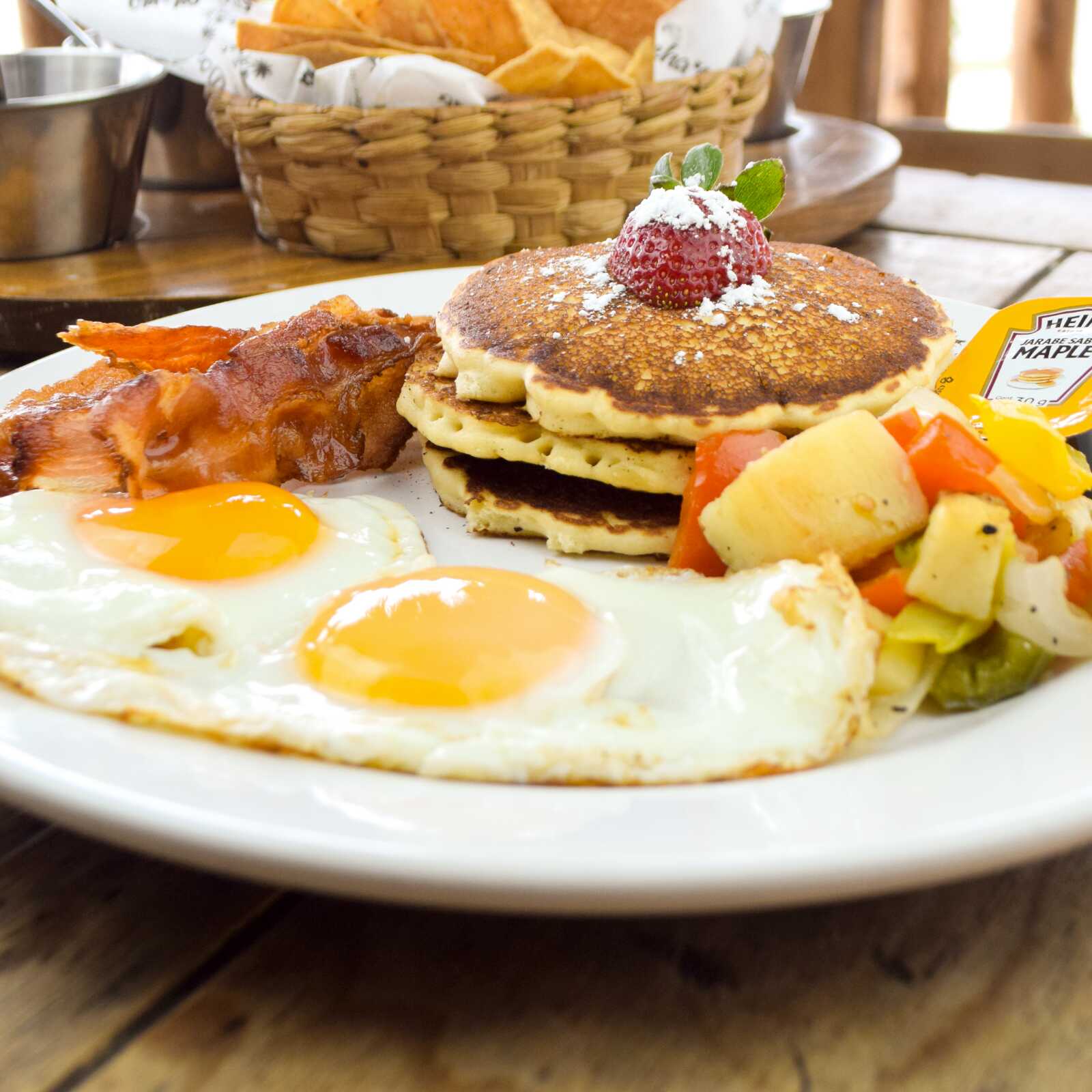 2 Huevos al gusto, 3 hot cakes con miel y fresas, papas campesinas y 2 tiras de tocino.