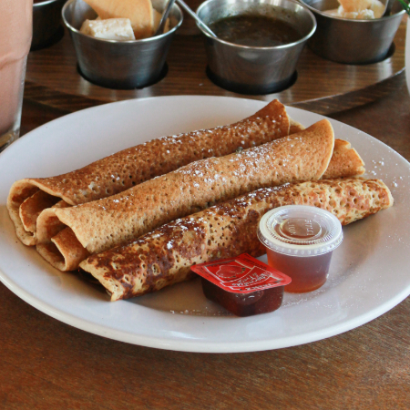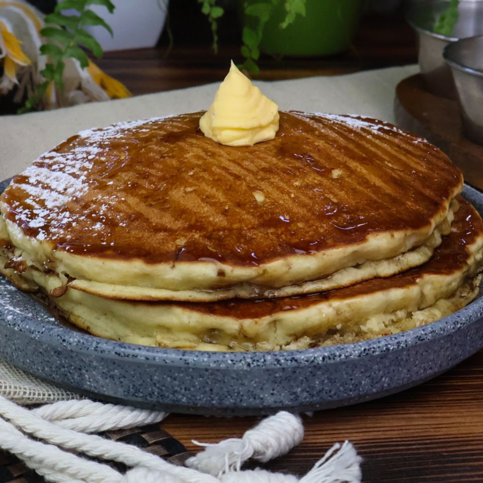 Acompañados con miel de maple y mantequilla.