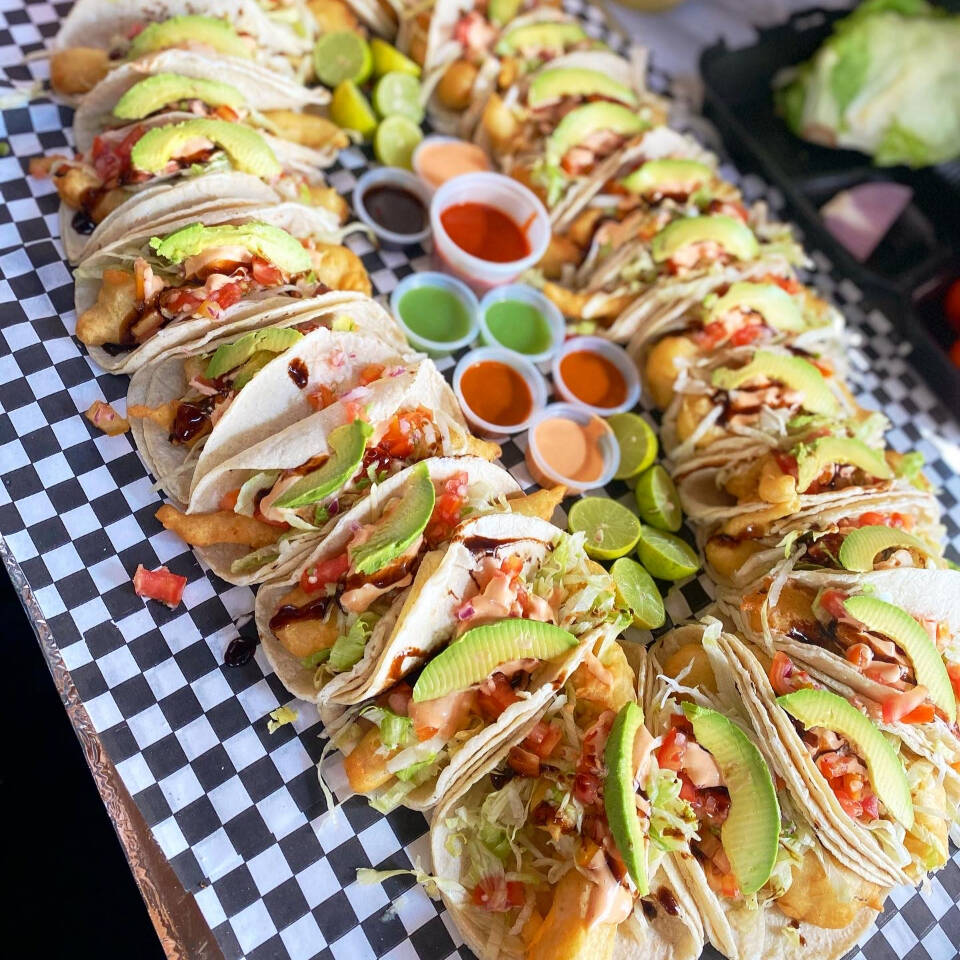 26 tacos capeados 13 de camaron y 13 de pescado acompañado de salsa mexicana aderezo chipotle y lechuga