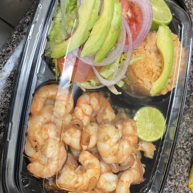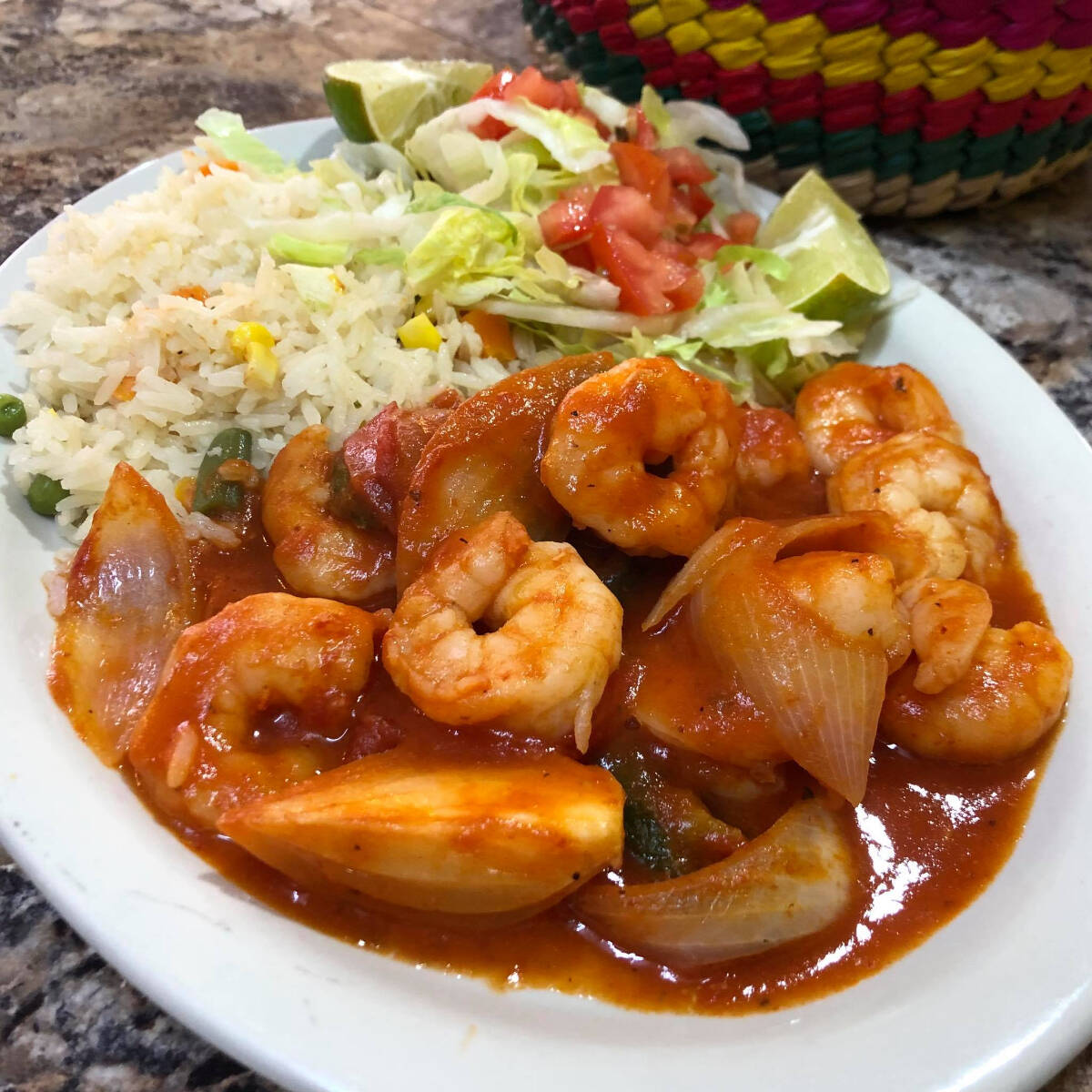 camarones a la mexicana con jitomate, cebolla y chile guisados al momento acompañados de arroz blanco y ensalada