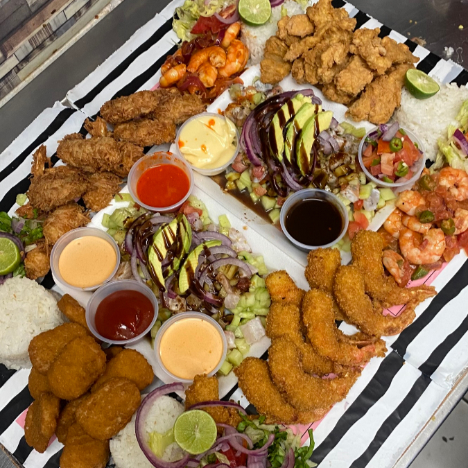 contiene los siguientes platillos: camarones empanizados, al coco , a la mexicana , a la diabla/ 2 ceviches camaron y pescado/ chicharron de pescado y Boneless de pescado con salsa búfalo acompañados de arroz y ensalada