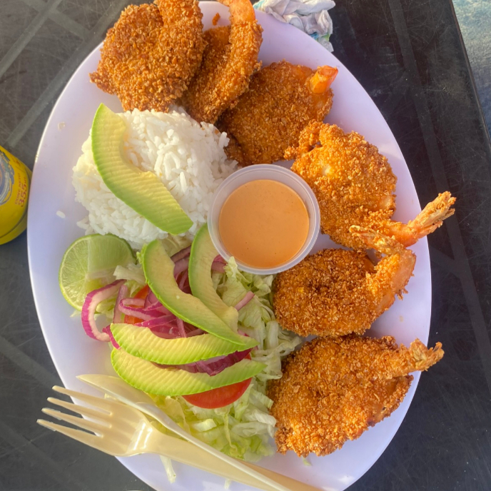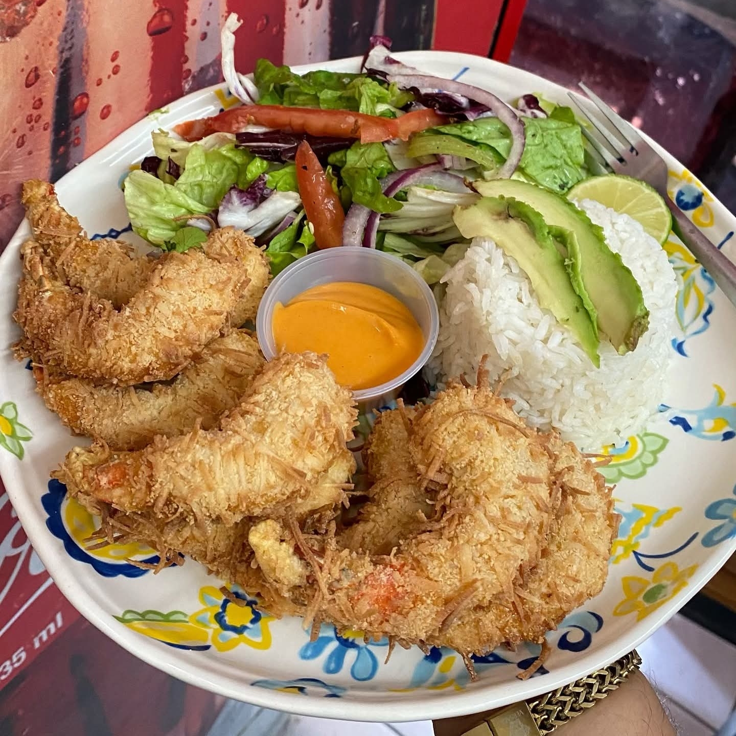 7 camarones empanizados con coco rallado acompañados de ensalada y arroz y aderezo chipotle
