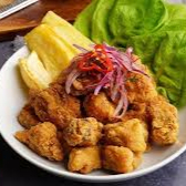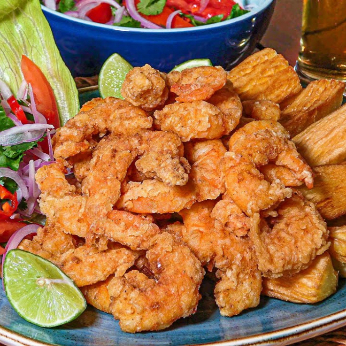 chicharron de camaron acompañado de arroz y ensalada tambien con salsas