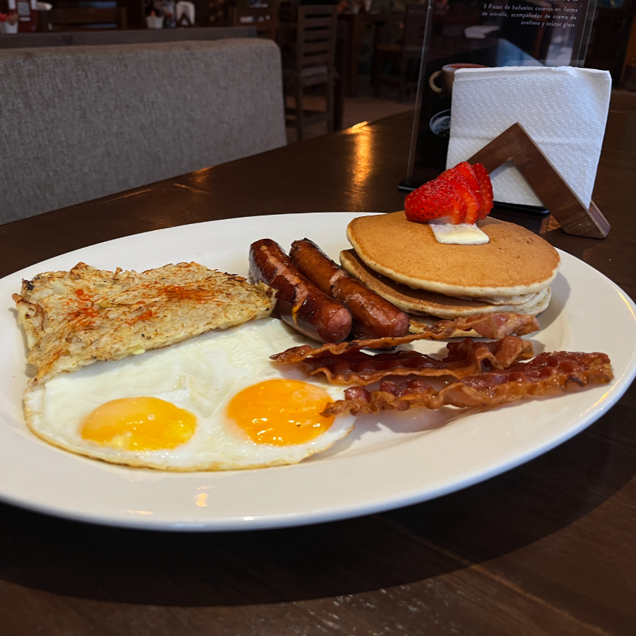 3 Piezas de hot cake o 1 pieza de waffle, papa hash brown, tocino, 2 piezas de salchicha johnsonville, 2 piezas de huevo al gusto.