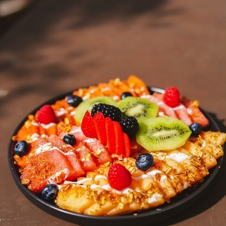 Papaya, melón y sandia acompañado de frutos rojos, yogurt griego y fruta de temporada.