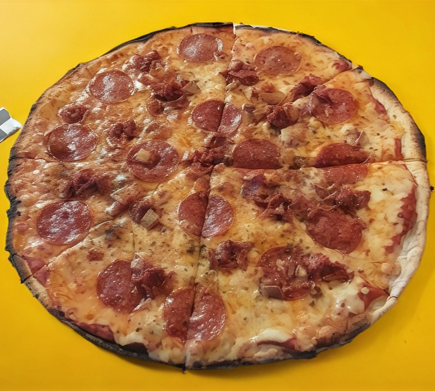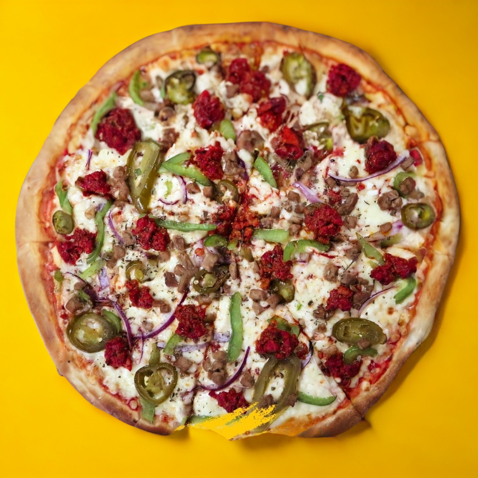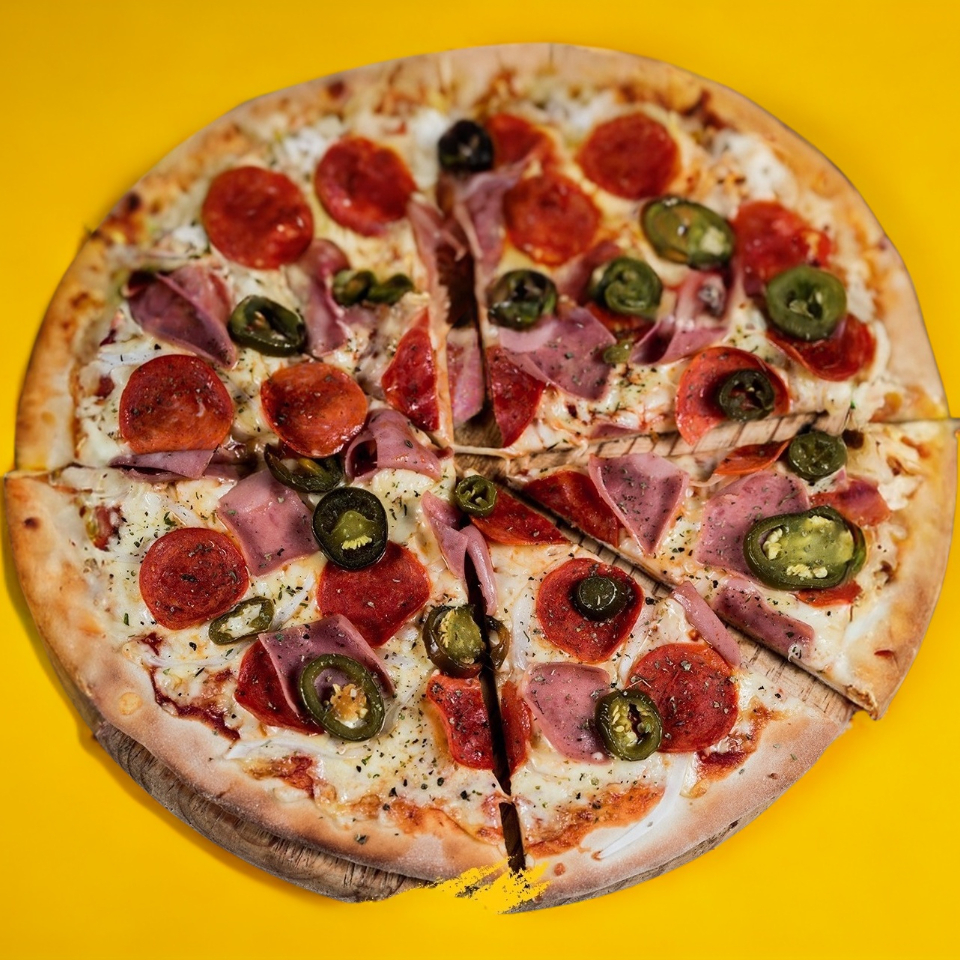 Peperoni, Jamón, Cebolla Morada y Chile Jalapeño.