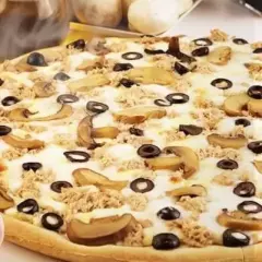 Pizza personal con 4 rebanadas con atún, champiñón y aceituna.