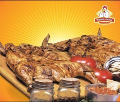 2 Pz de pollo, 100 g sopa fría, 100g de papas a la francesa, ensalada de lechuga, tomate, cebolla morada curtida y limón.