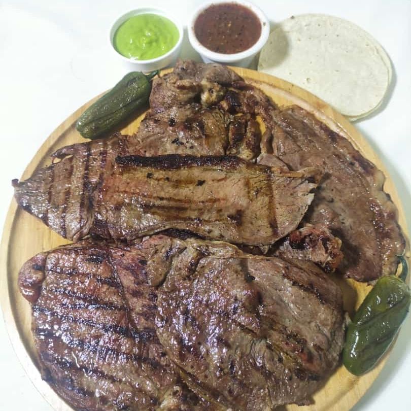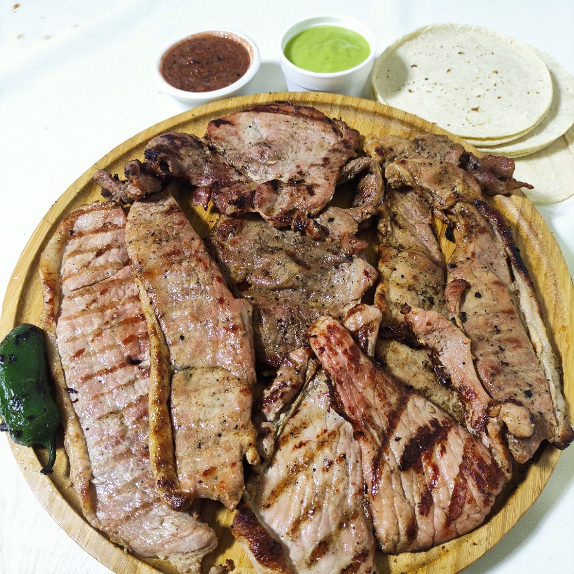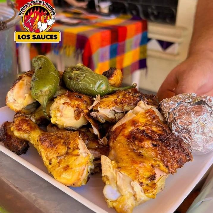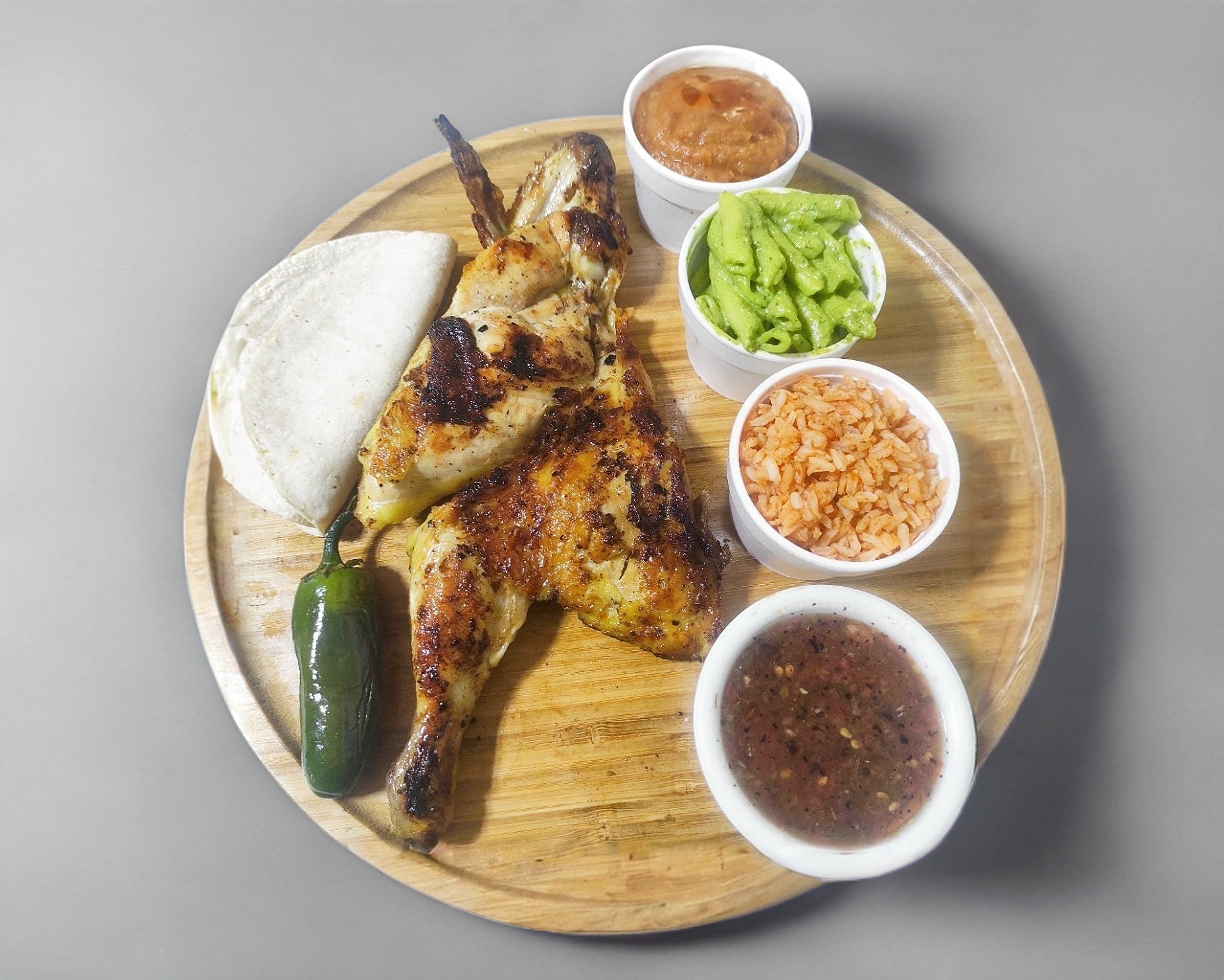 Un pollo, cuarto de arroz, cuarto de frijoles puercos, salsa, tortilla, chile toreado