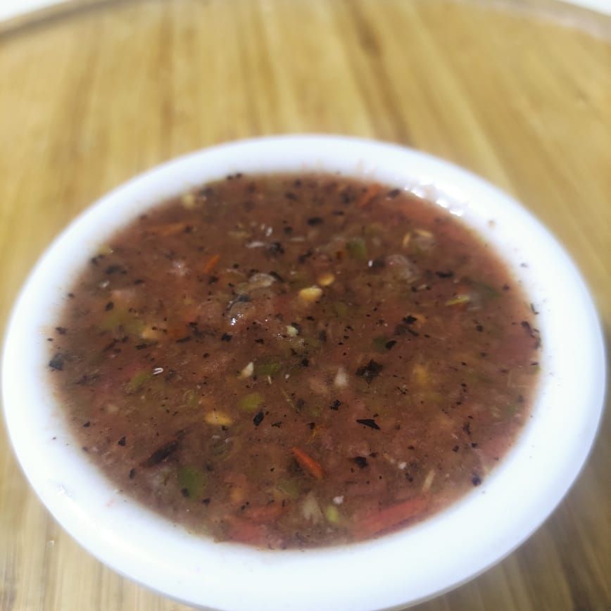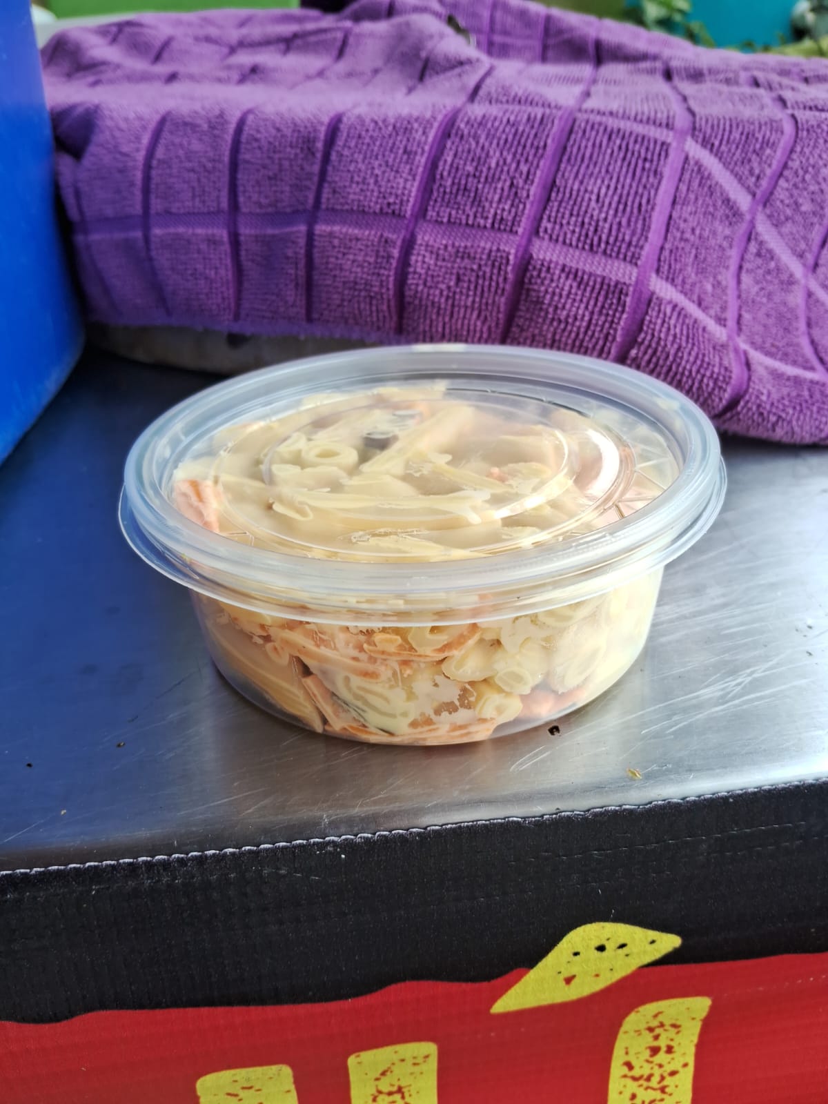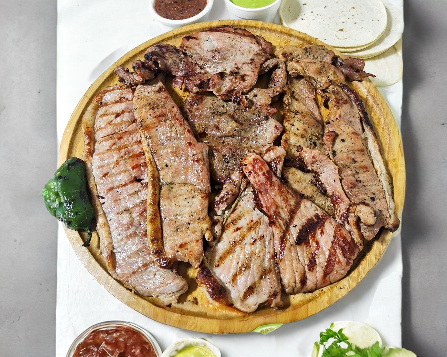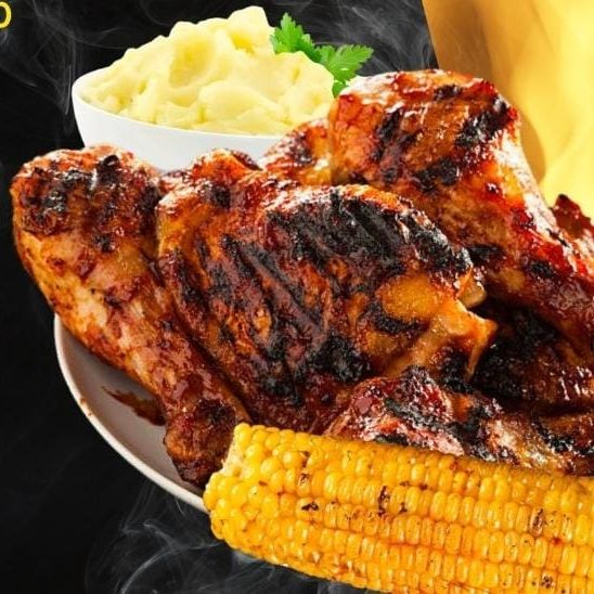 Un pollo, cuarto de arroz, cuarto de frijoles puercos, salsa, tortilla, chile toreado