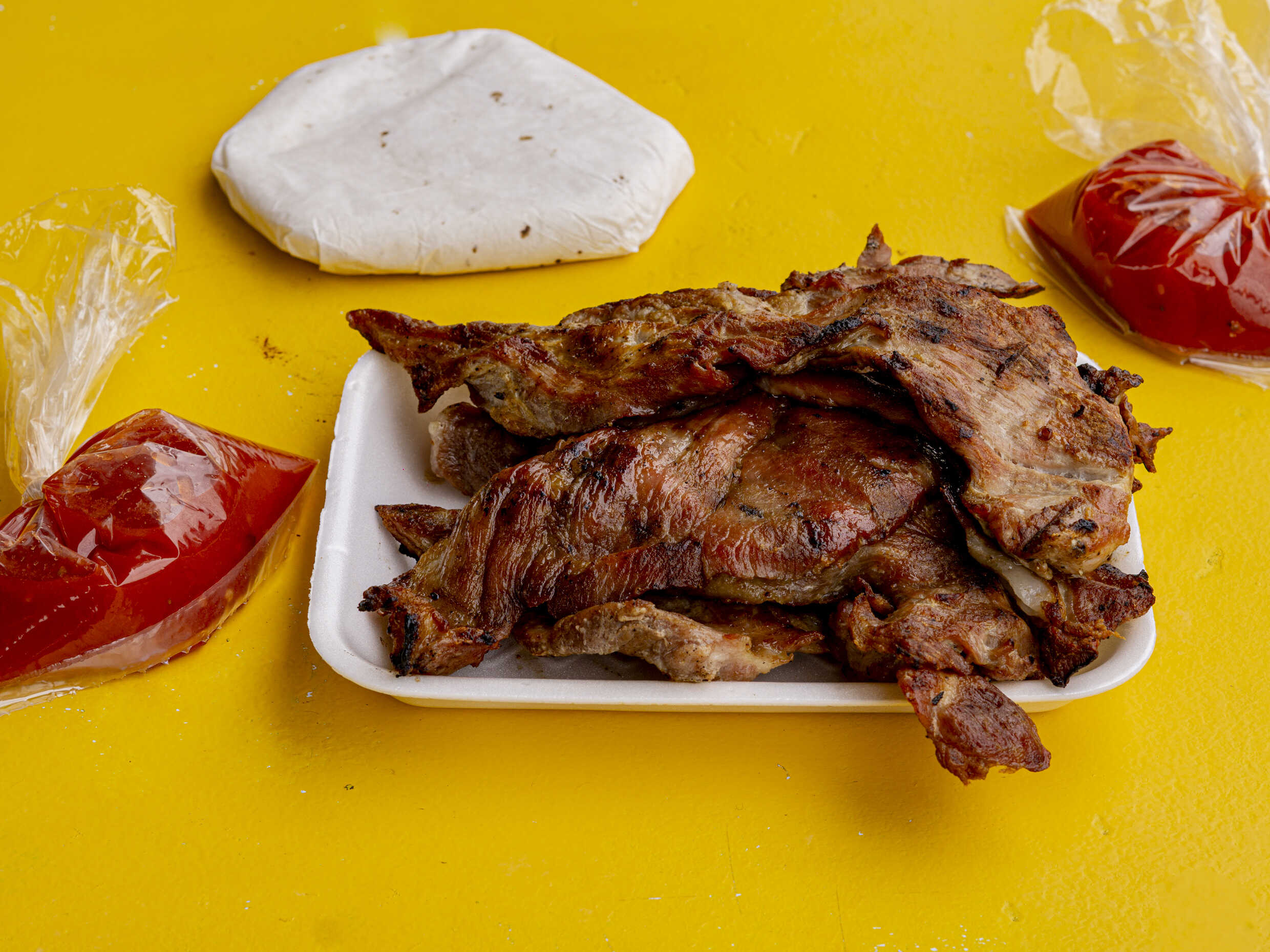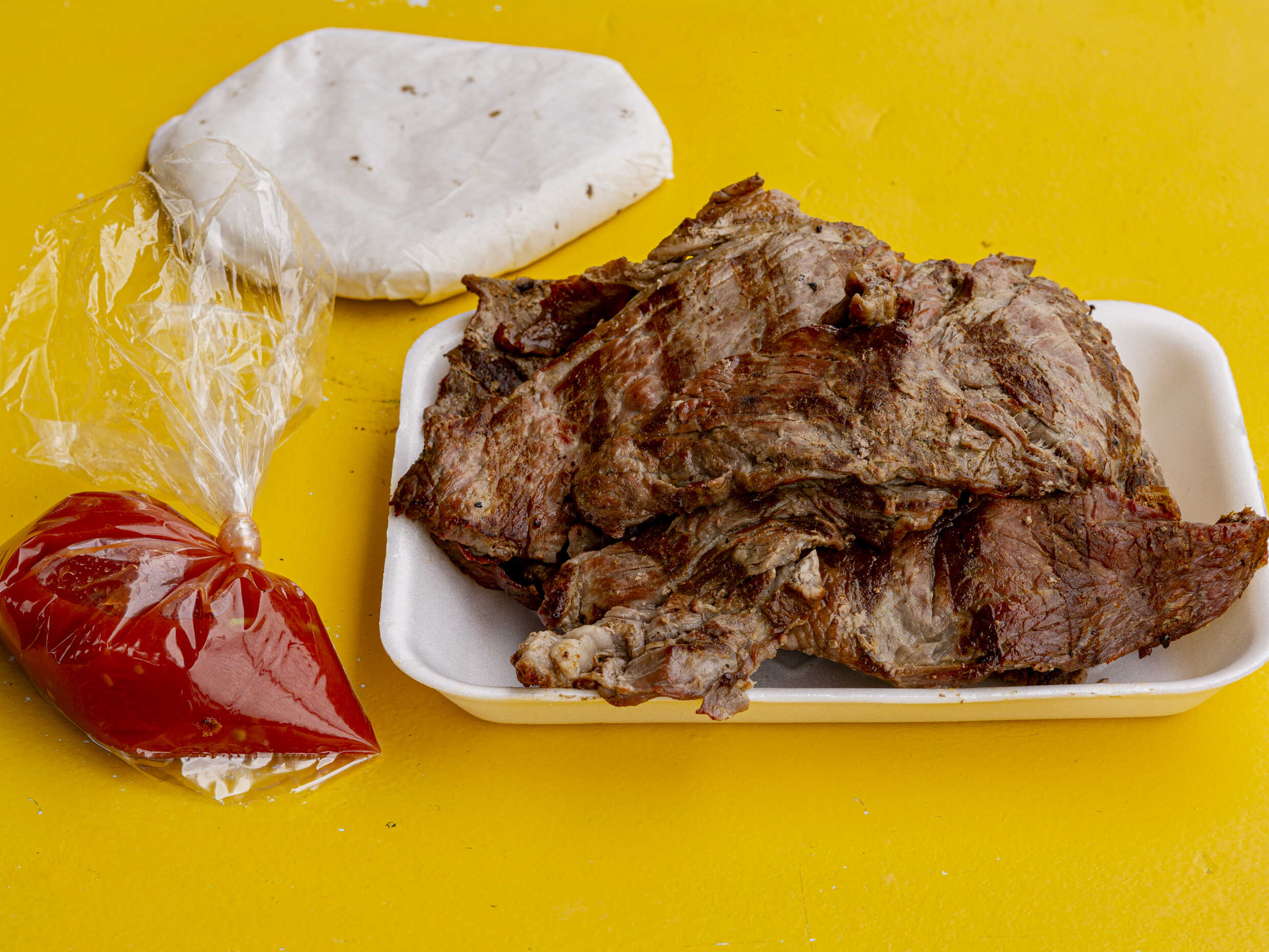 Deliciosa carne asada, acompañadas con tortillas, salsa, incluye papas fritas