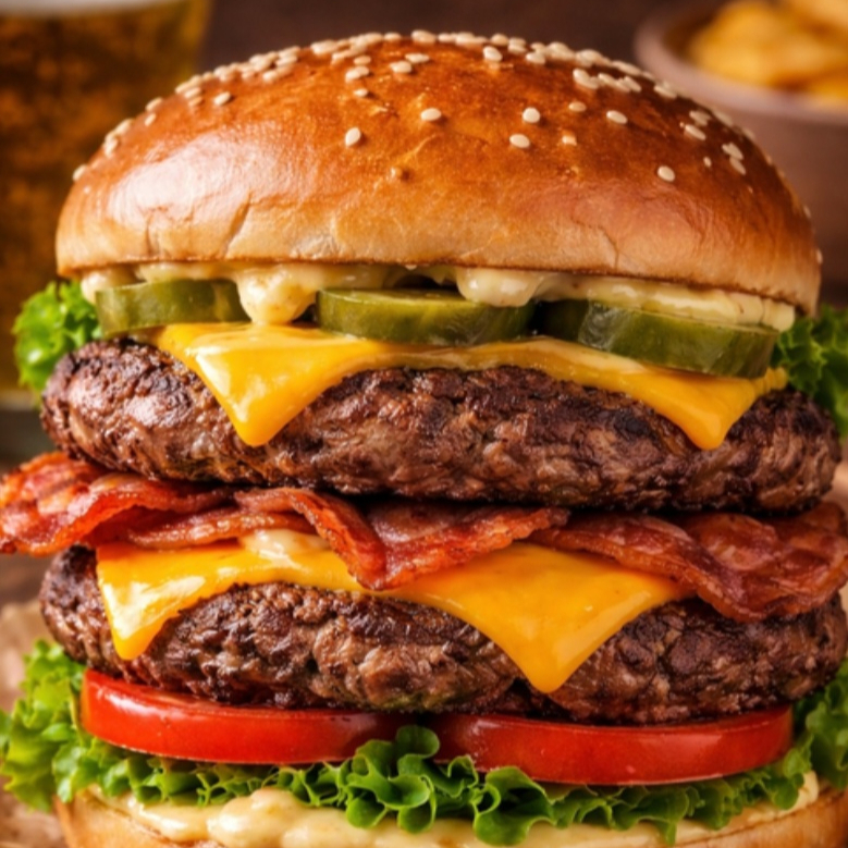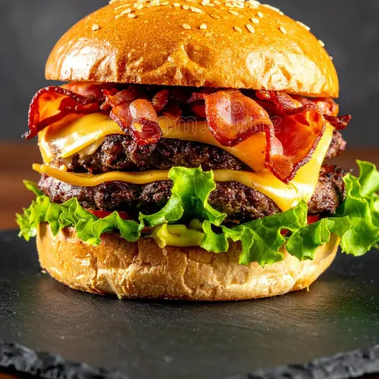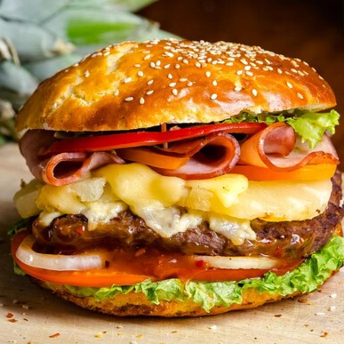 Pan ajonjoli negro con todo doble, carne sirlon, jamon, queso americano, tocino, lechuga, tomate y cebolla Incluye papas a la francesa sazonadas con lemon pepper.