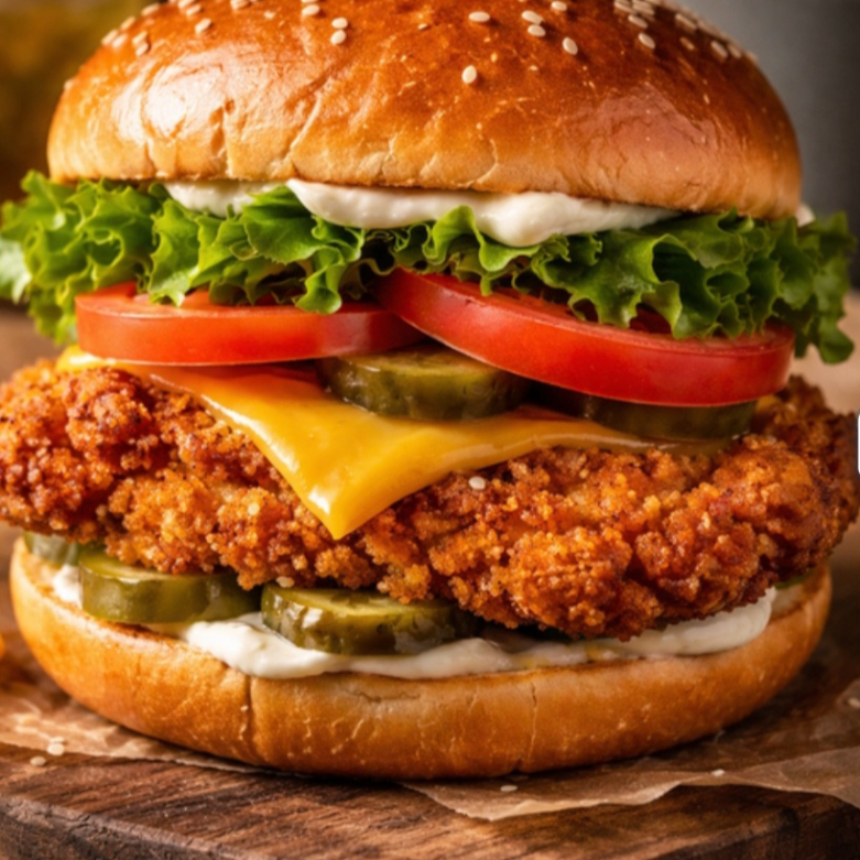 Pan ajonjoli negro, pollo empanizado bañado en salsa BBQ, queso machego, aros de cebolla, lechuga, tomate y cebolla. Incluye papas a la francesa sazonadas con lemon pepper.