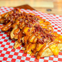 Papas con salchicha o tocino gratinadas, queso derretido, crema.