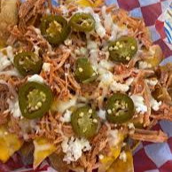 Totopo bañado con frijol, pierna, queso derretido, crema y queso cotija