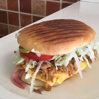 Pan costra de queso, carne sirlon, piña sellada con BBQ, cebollita caramelizada, queso machego, jamon, tocino, lechuga, tomate y cebolla. Incluye papas a la francesa sazonadas con lemon pepper.
