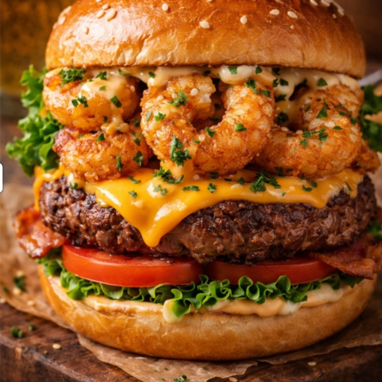 Pan ajonjoli negro, carne sirlon, camaron, quesos amaeicano y machego, tocino, lechuga, tomate, cebolla. Incluye papas a la francesa sazonadas con lemon pepper.