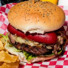 Pan ajonjoli negro, carne de sirlon, queso americano, lechuga, tomate, cebolla . Incluye porcion de papas a la francesa sazonadas con lemon pepper