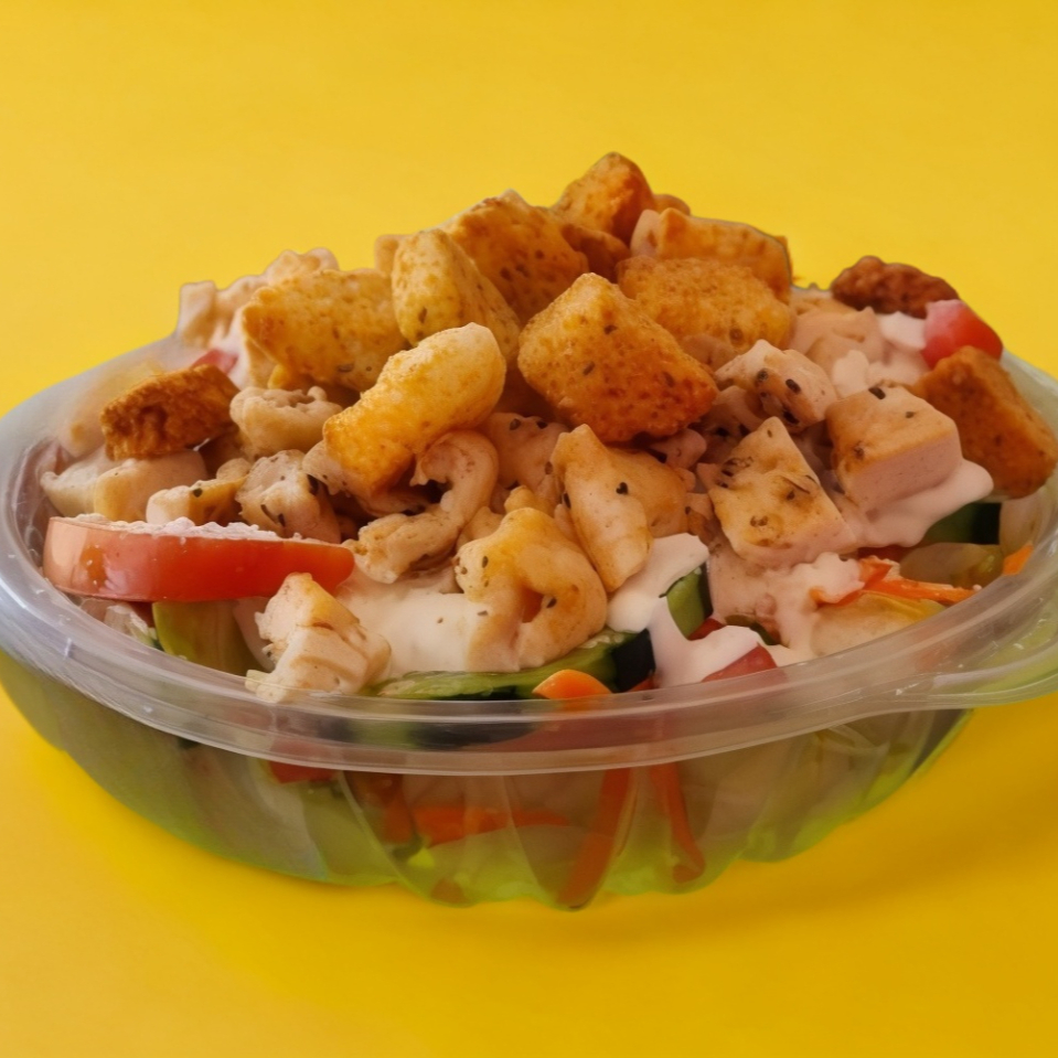 Lechuga, zanahoria, tomate, pepino, queso parmesano, crutones, aderezo y proteína a elegir