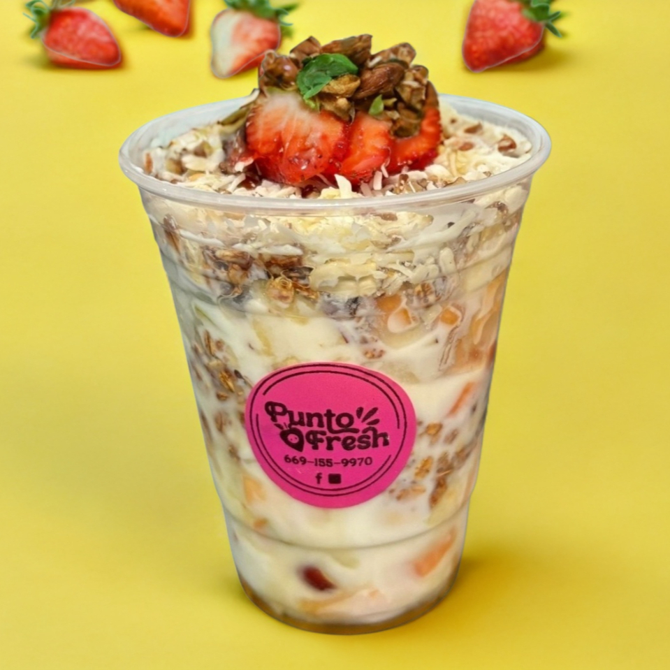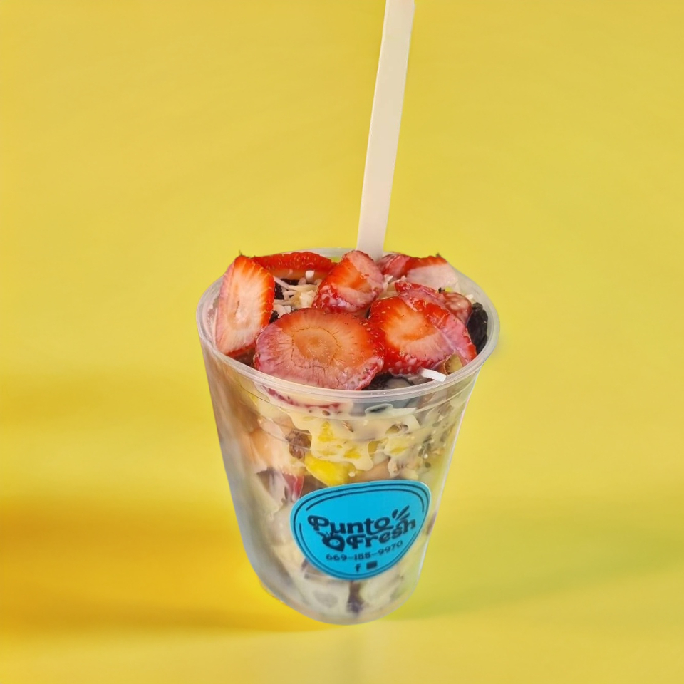 Coctel de frutas, bañadas en lecherita, coronadas con granola, nuez, coco y pasas.