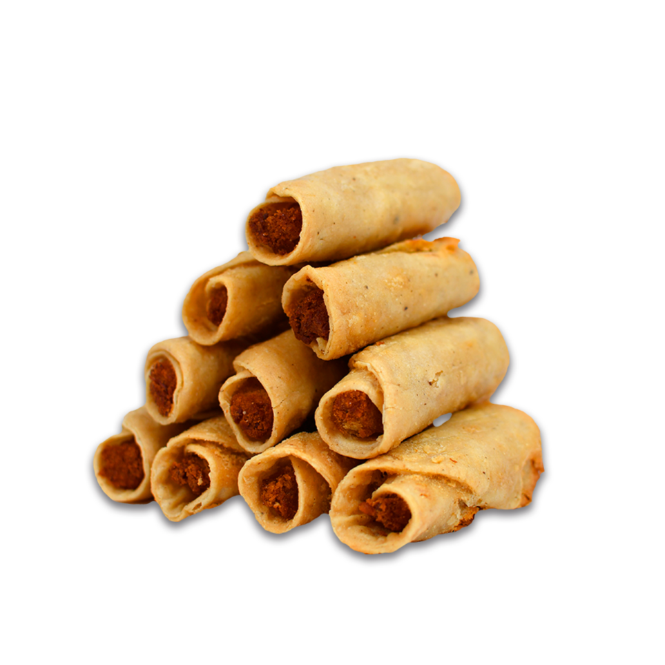 10 dorados y crujientes taquitos rellenos de papa y pollo acompañados de una salsa roja.