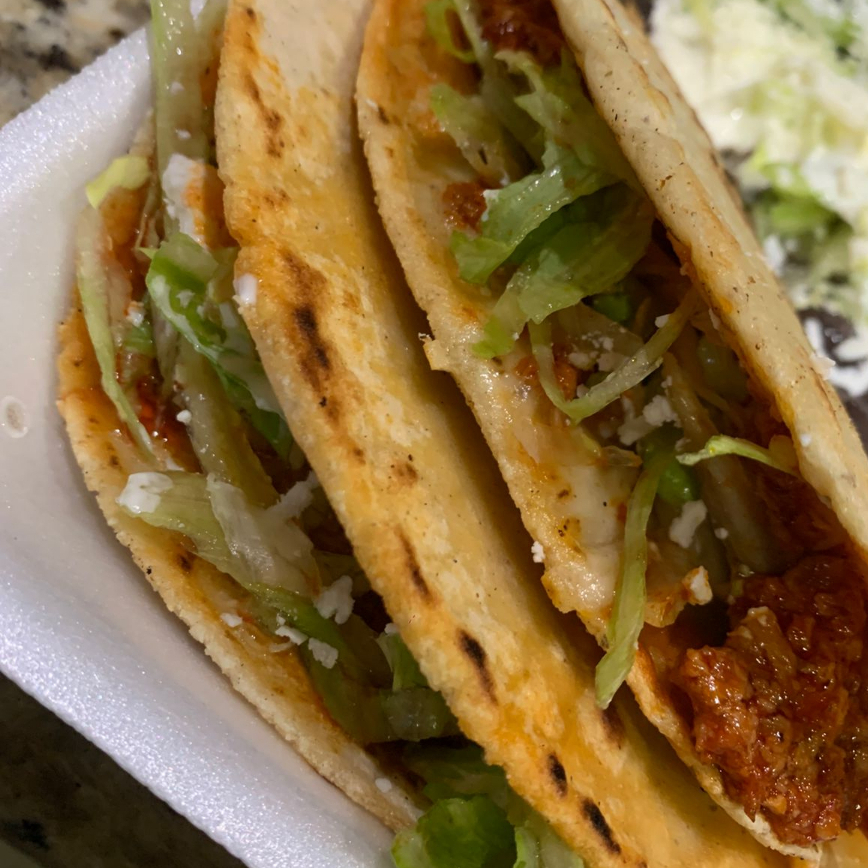 Tortilla de maíz con carne de res desebrada quesillo, crema, lechuga y queso