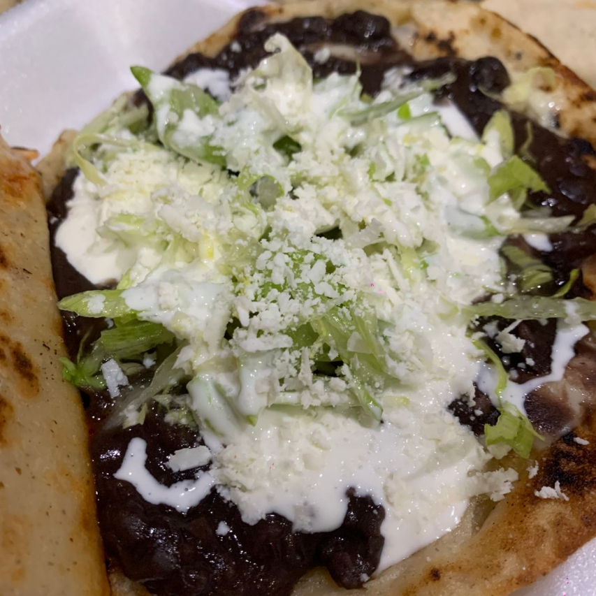 Tortilla de maíz con quesillo frijoles negros, crema, lechuga y queso.