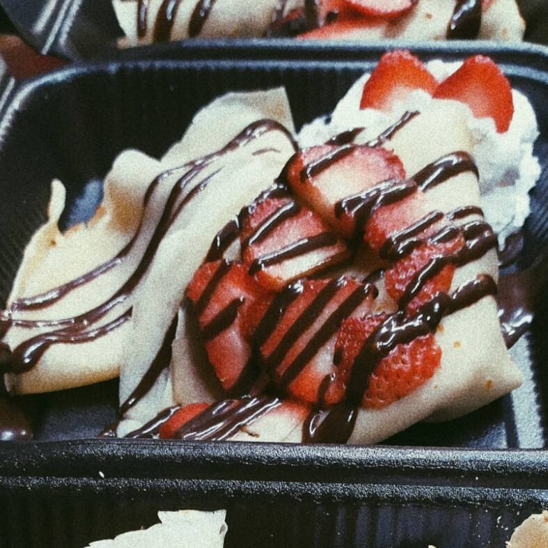 Rica y fresca crepa rellena de mousse de chocolate y fresas, rallada con Nutella. Acompañada con un topping de crema batida y fresas.