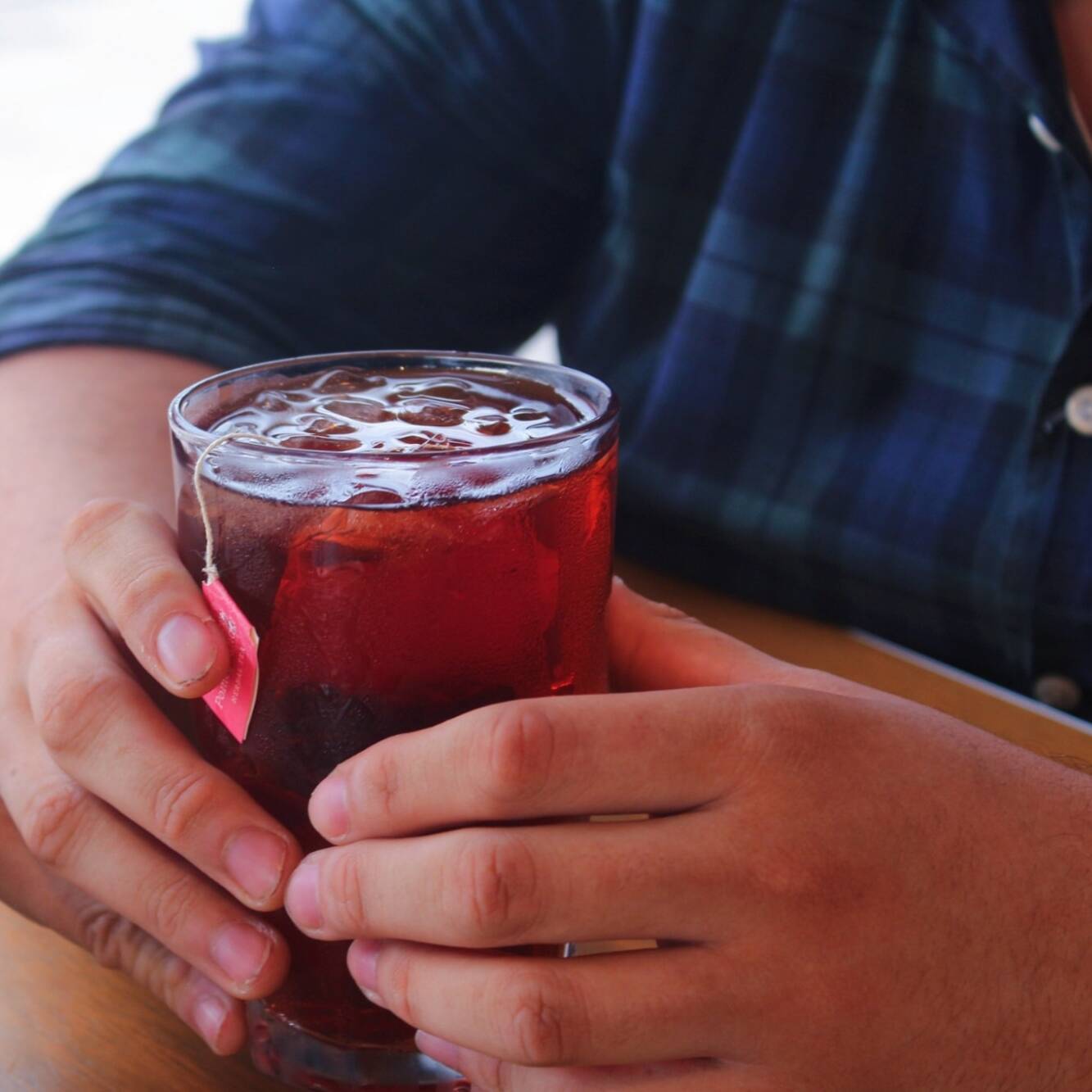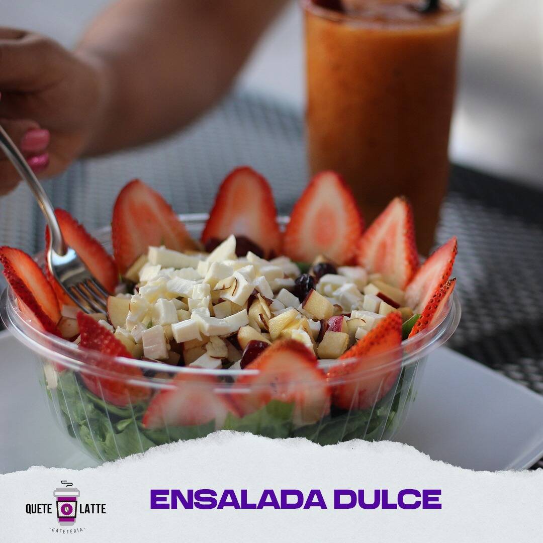 Lechuga, panela, manzana roja, almendra, arándano, fresa, aderezo de miel y cebolla.